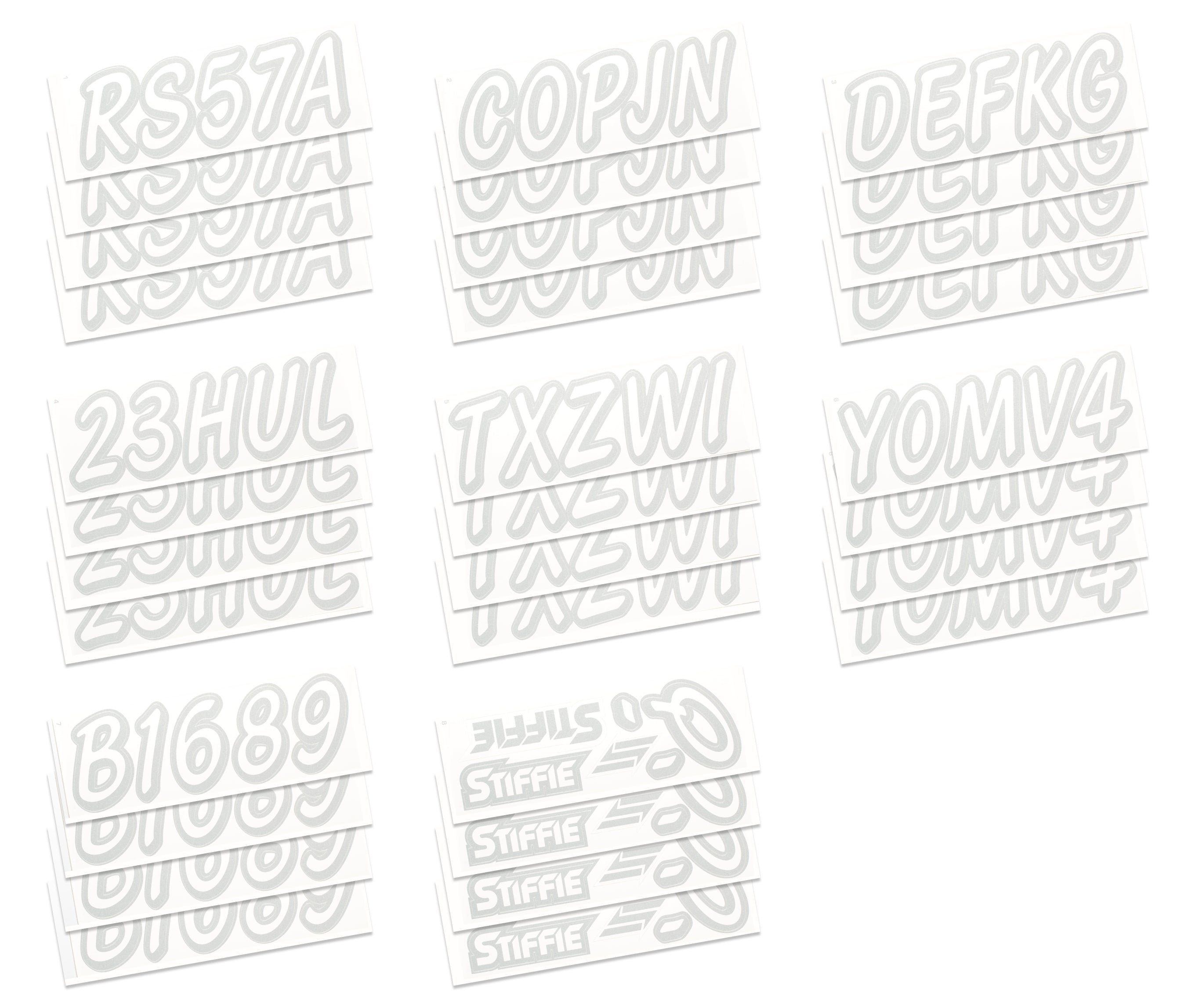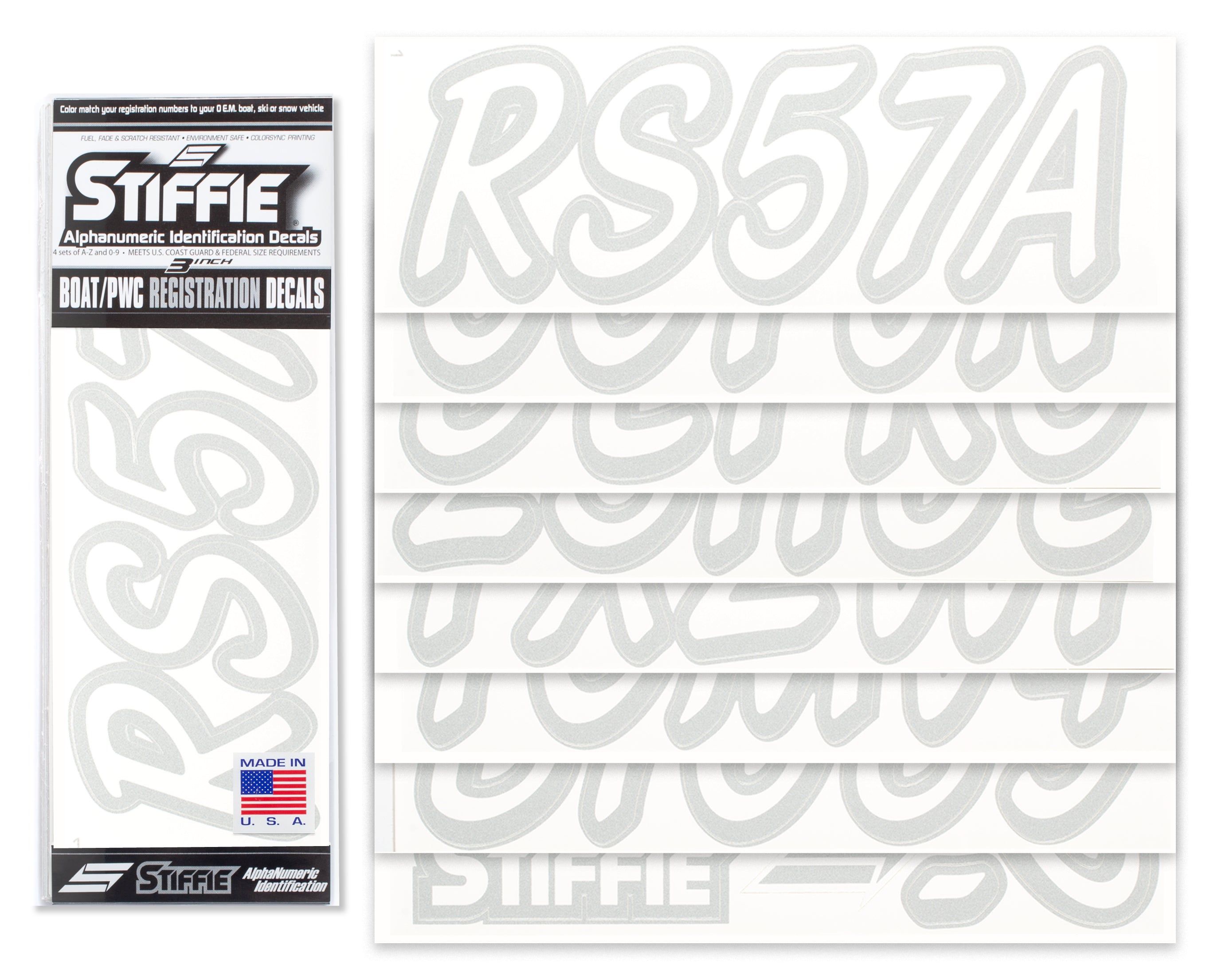 All Alphanumeric ID Kits offered by STIFFIE come with characters that are 3" in height and meet or exceed US Coast Guard Regulations. Every ID kit comes with 4 sets of 0-9 and A-Z decals (146 total decals). STIFFIE Alphanumeric registration decals are resistant to chemical deterioration, fading, curling, tearing and scratching. STIFFIE decals are also UV Coated for protection from harmful ultra-violet (UV) rays.