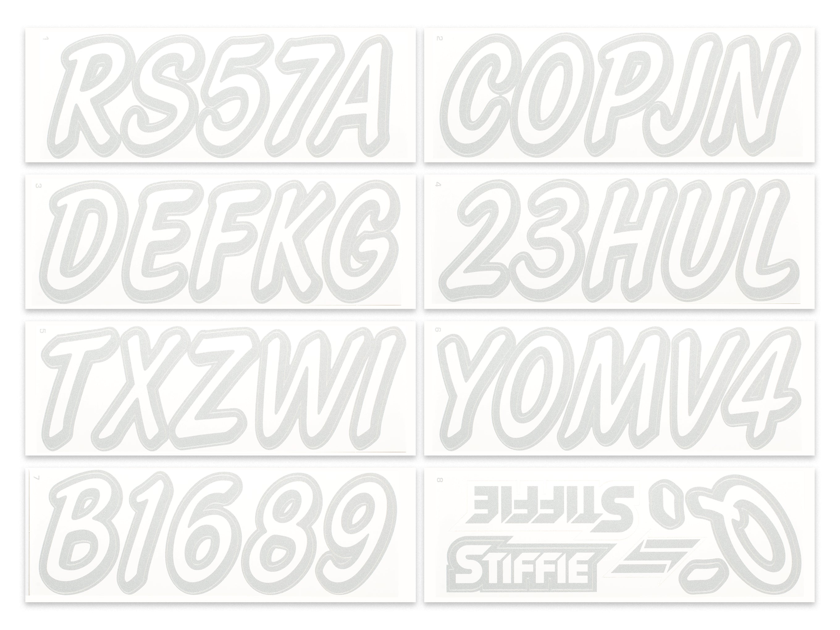 The STIFFIE WhiplineSolid™ Alpha Numeric Identification Kit is a spinoff of our best-selling STIFFIE Whipline™ design. They both use the same cursive font with a forward-facing slant and smooth, rounded edges but STIFFIE WhiplineSolid™ is offered as a solid fill, two-color boat registration numbers and letters.