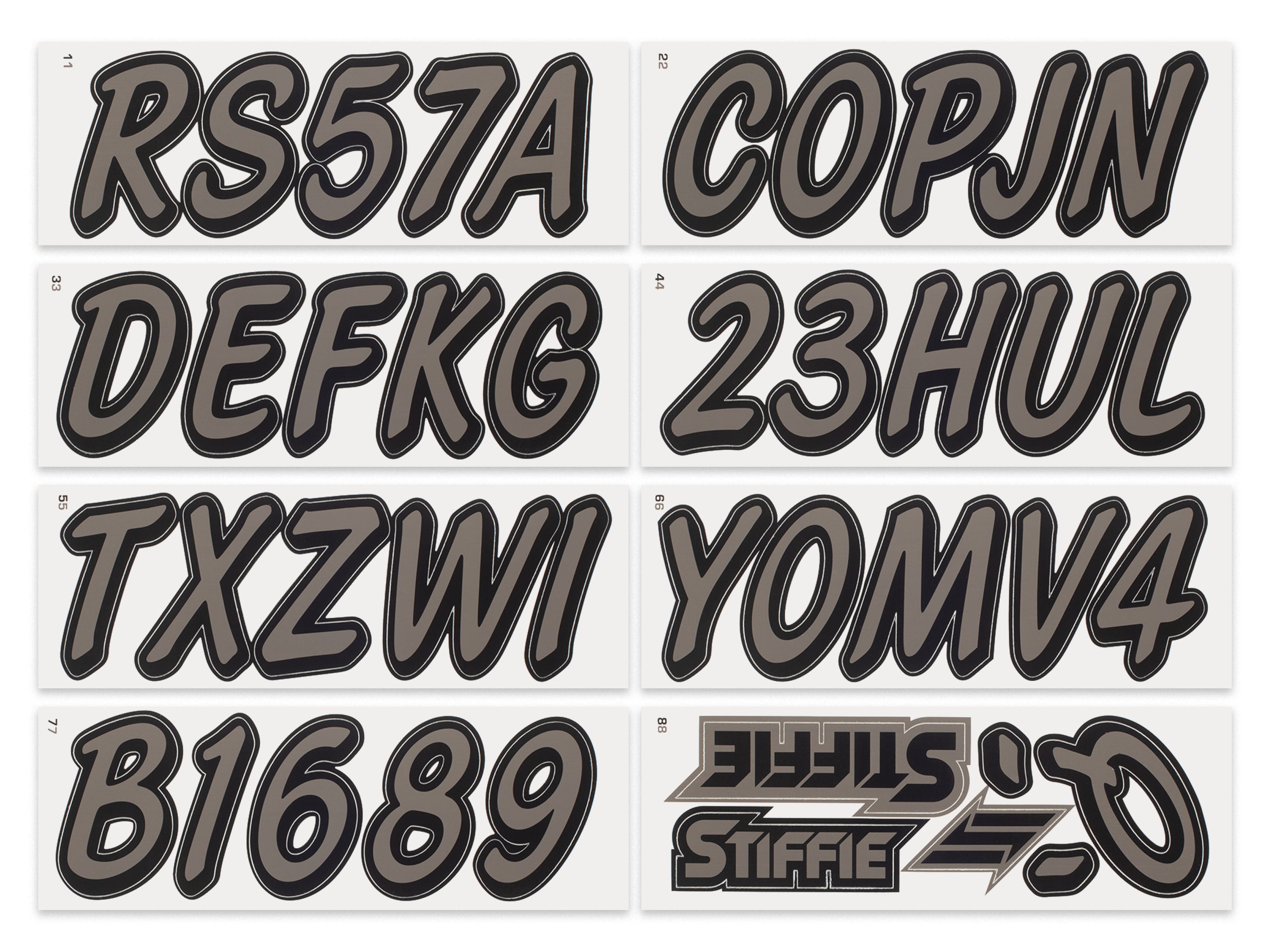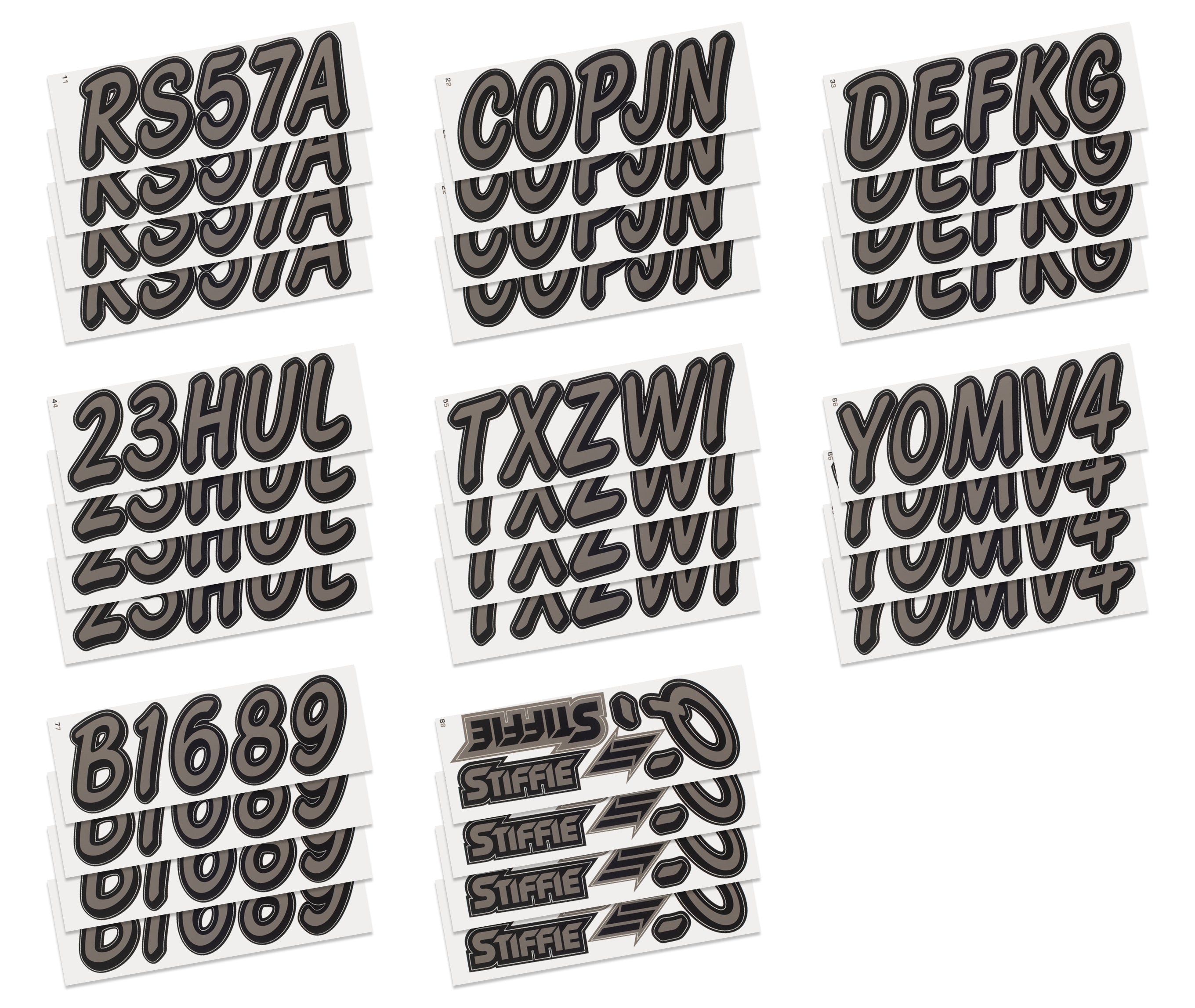 The STIFFIE WhiplineSolid™ Alpha Numeric Identification Kit is a spinoff of our best-selling STIFFIE Whipline™ design. They both use the same cursive font with a forward-facing slant and smooth, rounded edges but STIFFIE WhiplineSolid™ is offered as a solid fill, two-color boat registration numbers and letters.