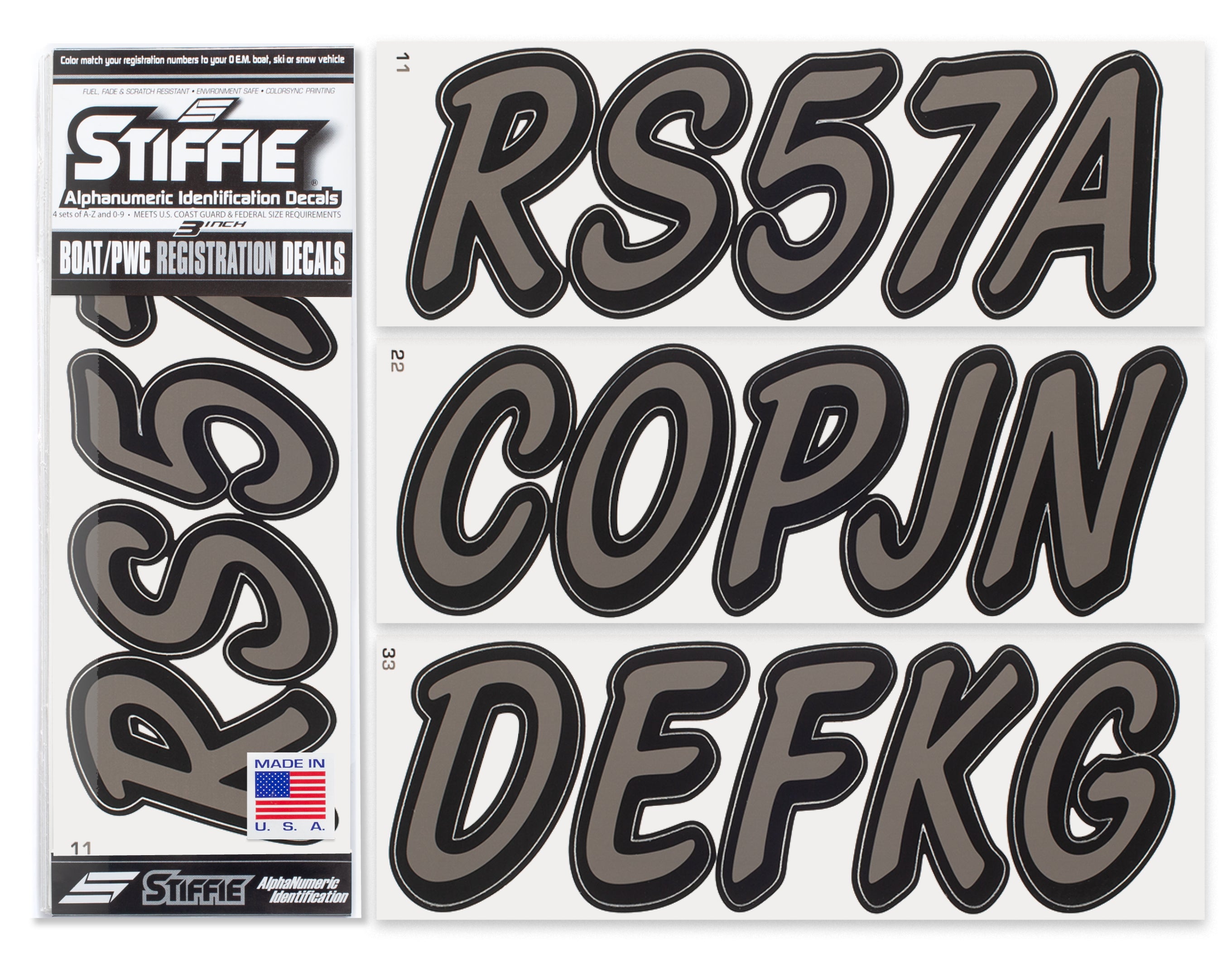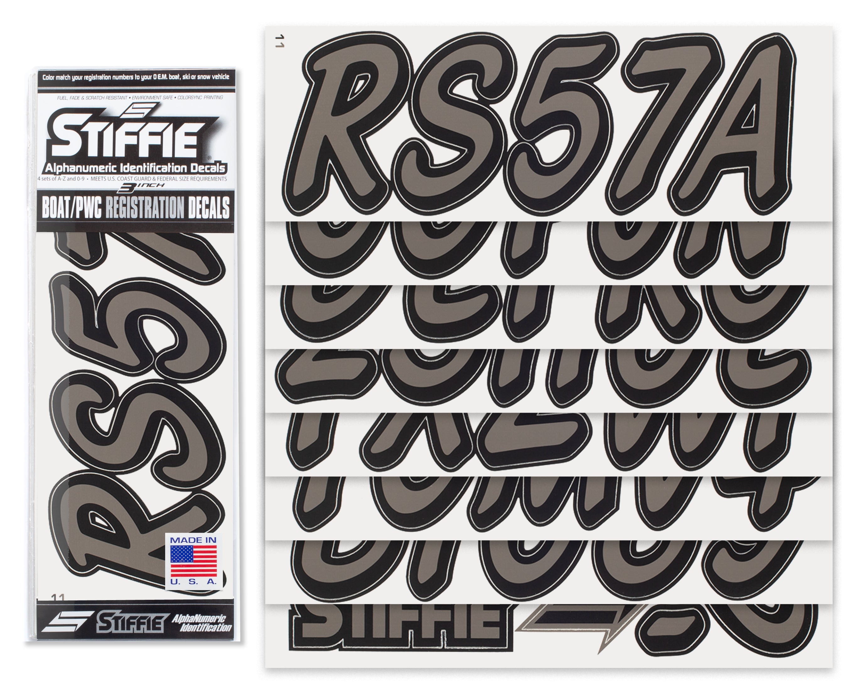All Alphanumeric ID Kits offered by STIFFIE come with characters that are 3" in height and meet or exceed US Coast Guard Regulations. Every ID kit comes with 4 sets of 0-9 and A-Z decals (146 total decals). STIFFIE Alphanumeric registration decals are resistant to chemical deterioration, fading, curling, tearing and scratching. STIFFIE decals are also UV Coated for protection from harmful ultra-violet (UV) rays.