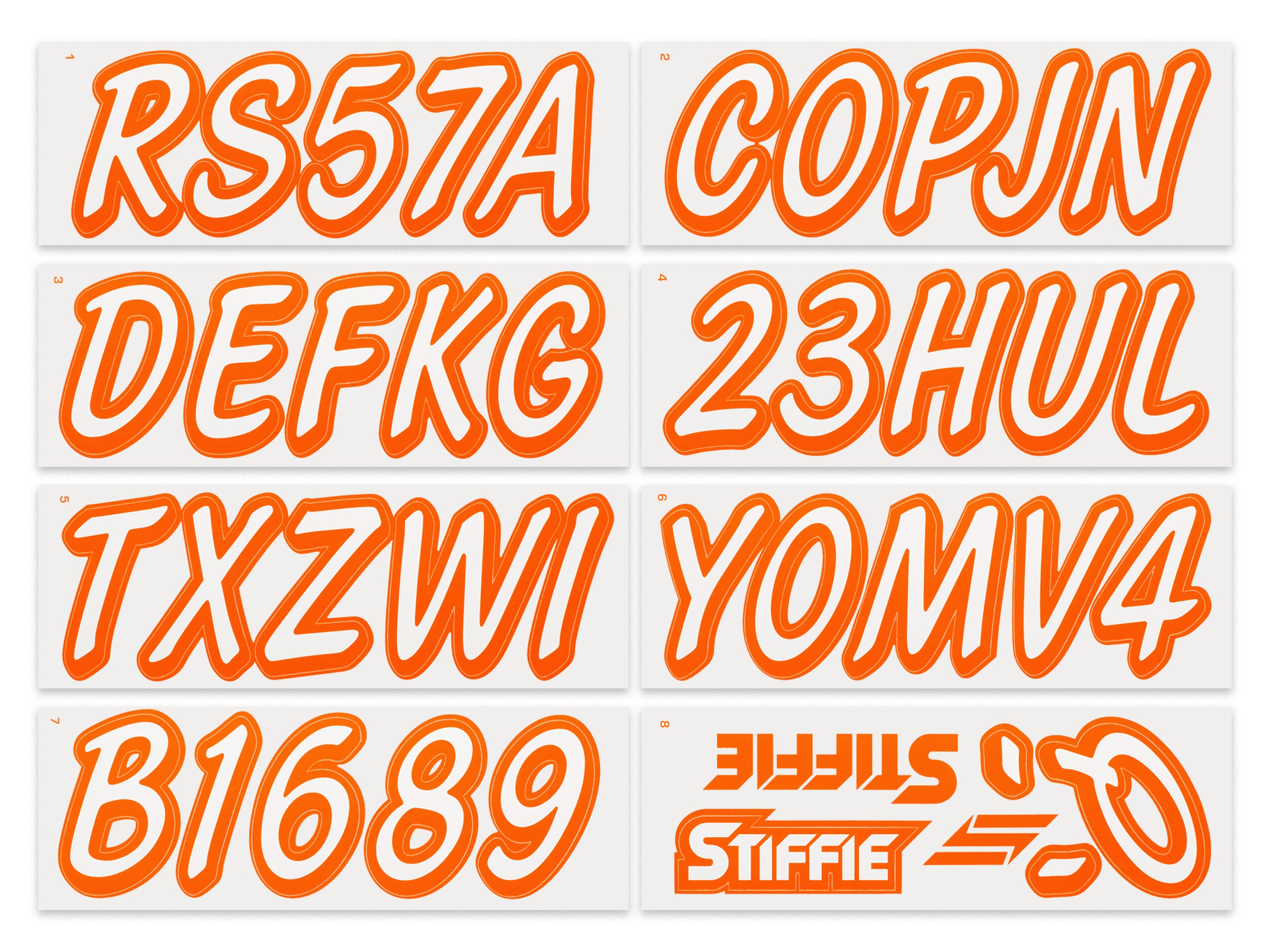 The STIFFIE WhiplineSolid™ Alpha Numeric Identification Kit is a spinoff of our best-selling STIFFIE Whipline™ design. They both use the same cursive font with a forward-facing slant and smooth, rounded edges but STIFFIE WhiplineSolid™ is offered as a solid fill, two-color boat registration numbers and letters.