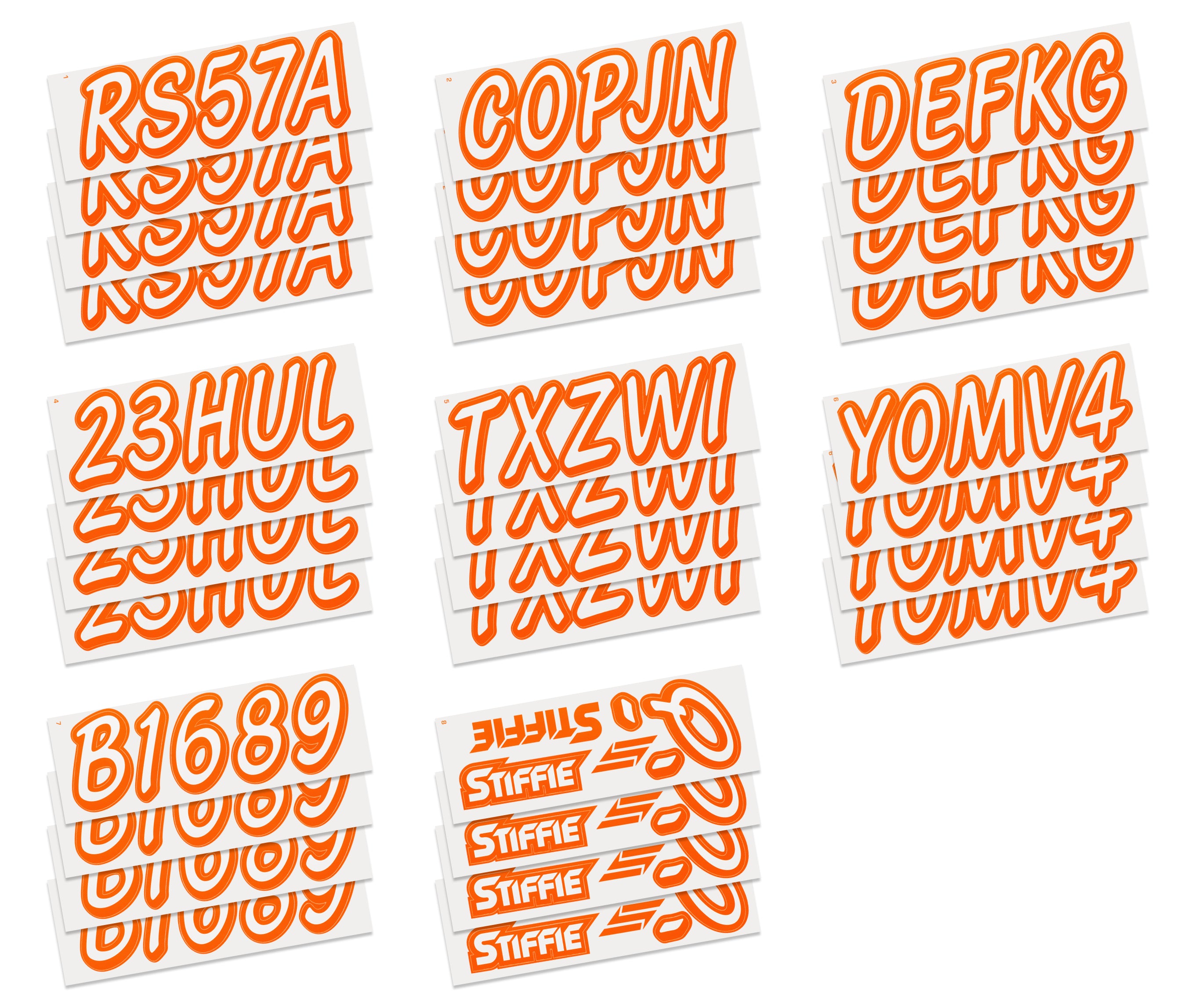 All Alphanumeric ID Kits offered by STIFFIE come with characters that are 3" in height and meet or exceed US Coast Guard Regulations. Every ID kit comes with 4 sets of 0-9 and A-Z decals (146 total decals). STIFFIE Alphanumeric registration decals are resistant to chemical deterioration, fading, curling, tearing and scratching. STIFFIE decals are also UV Coated for protection from harmful ultra-violet (UV) rays.