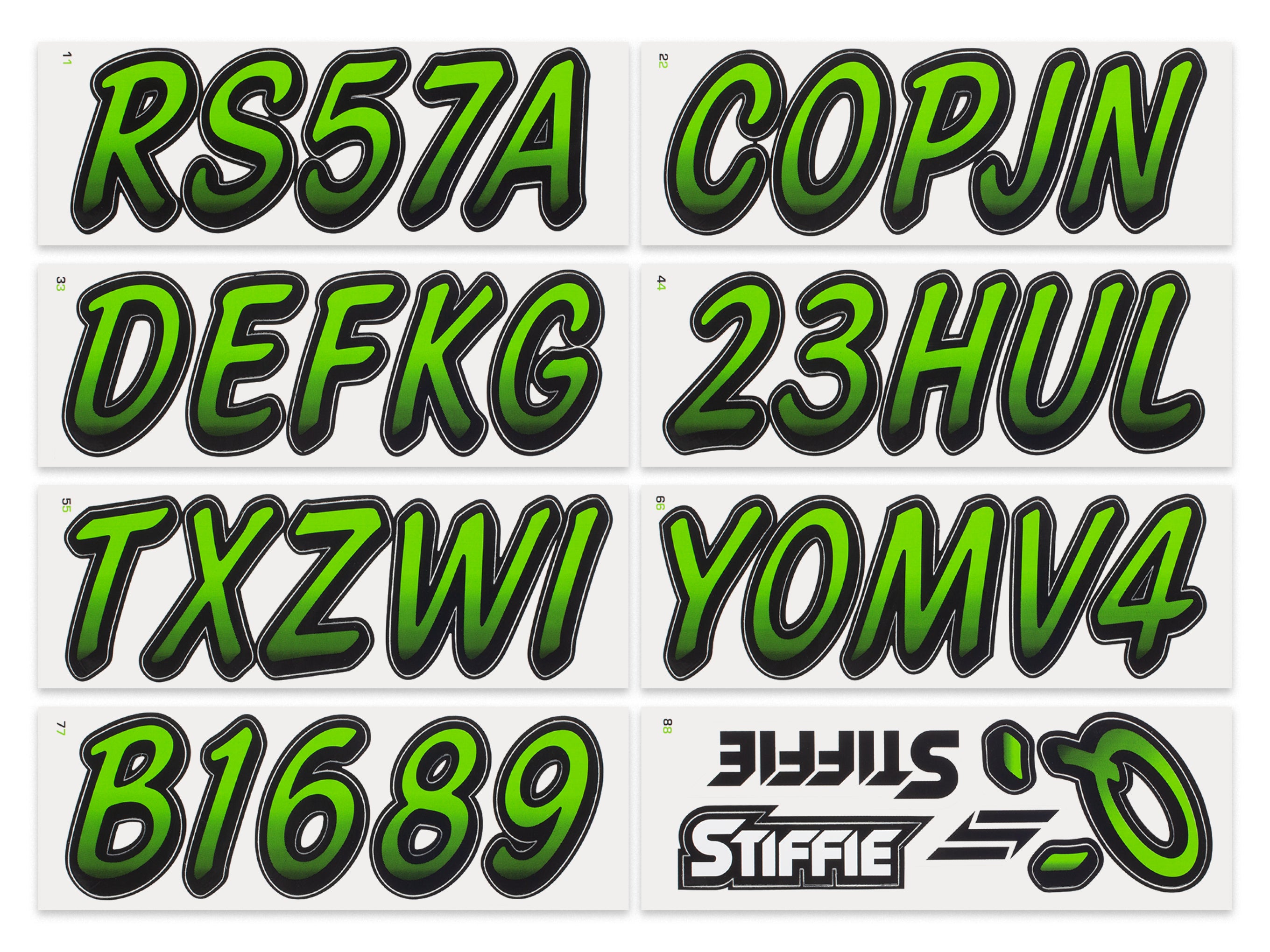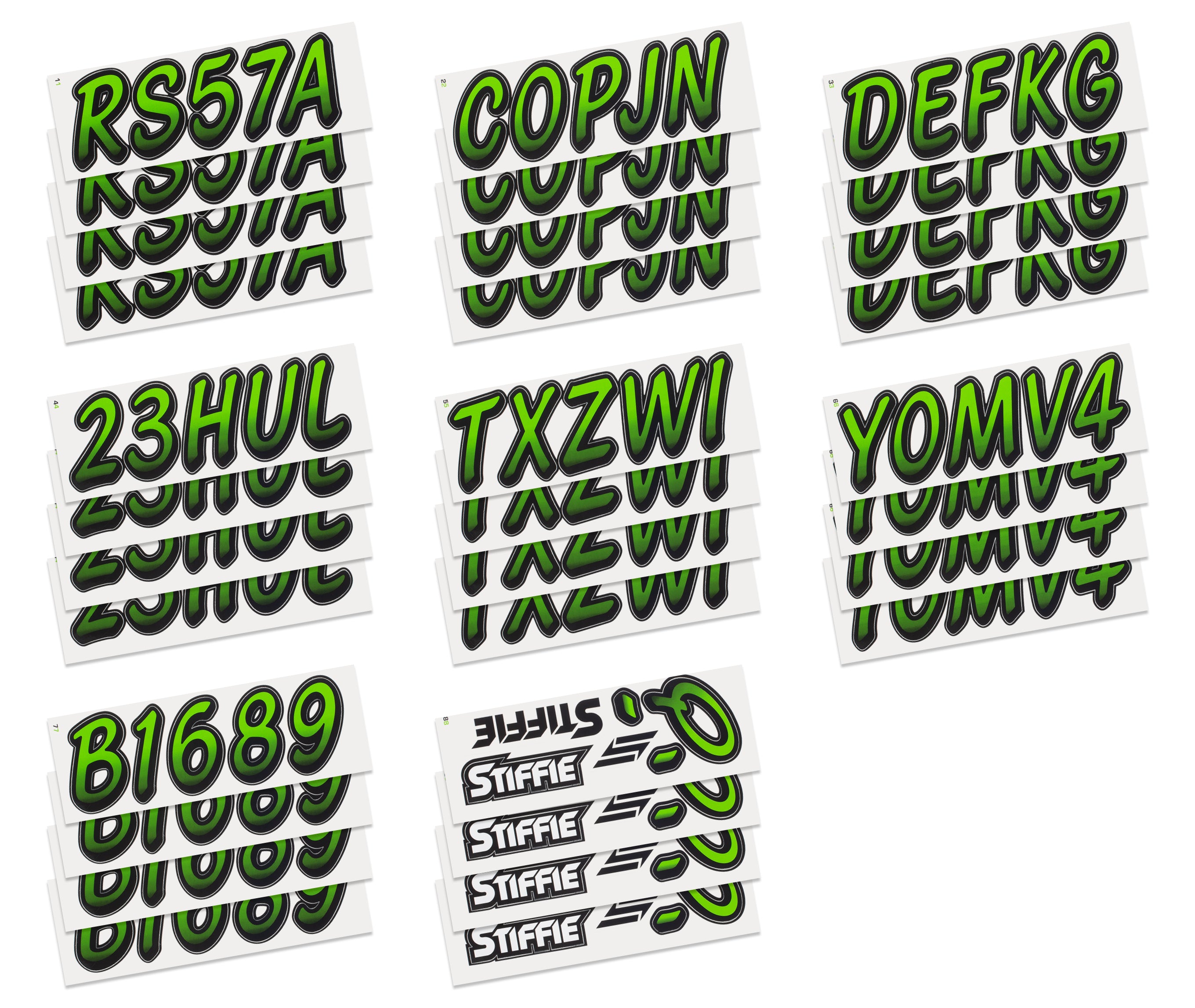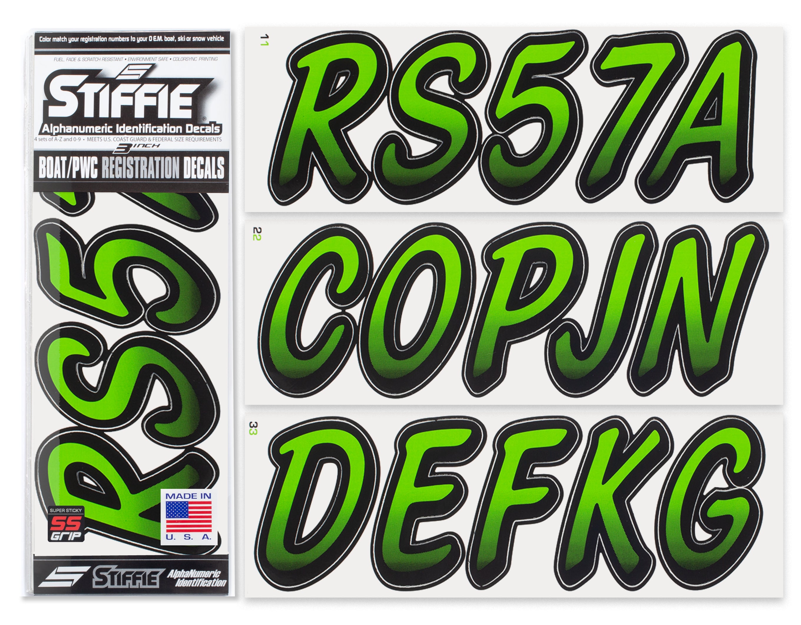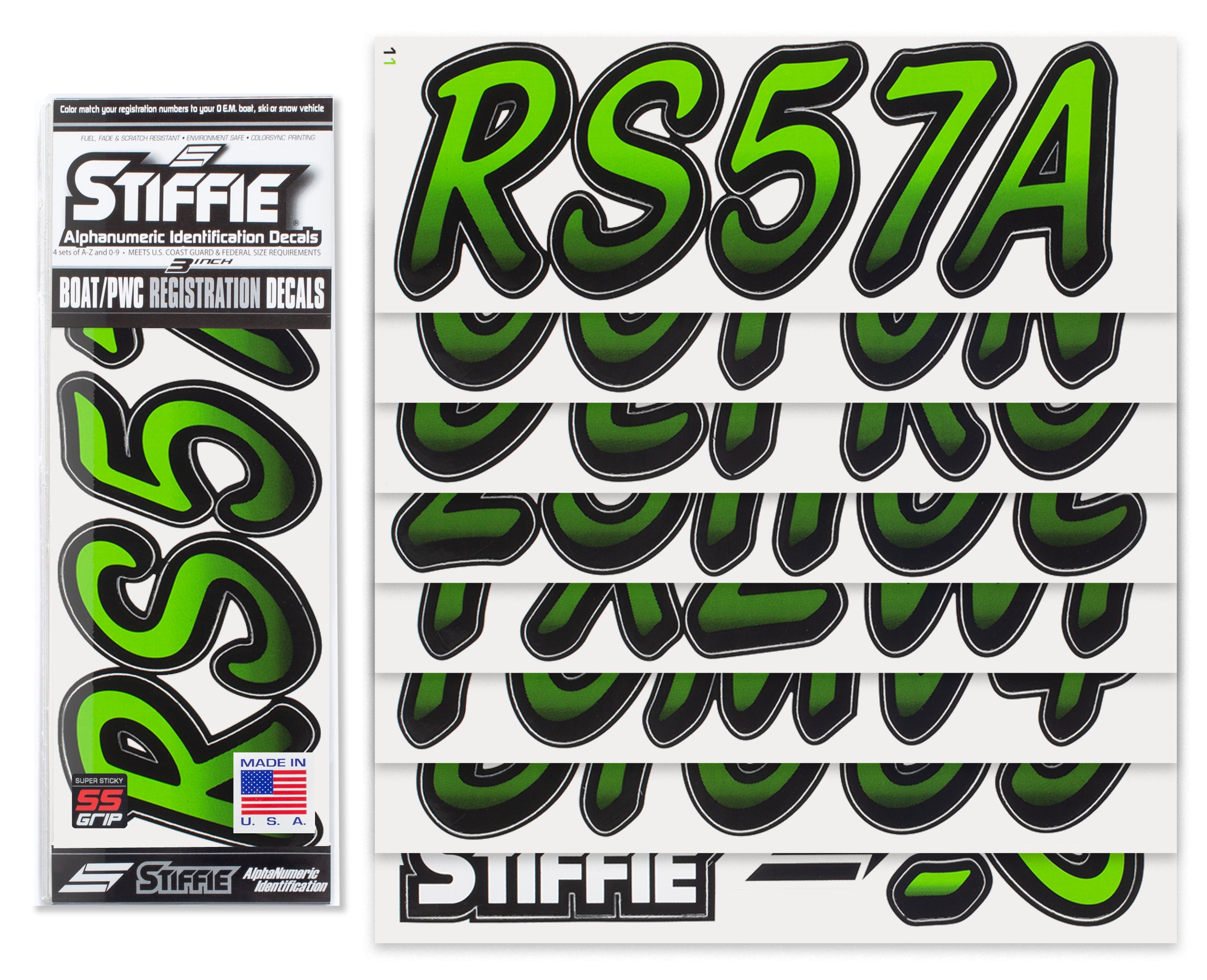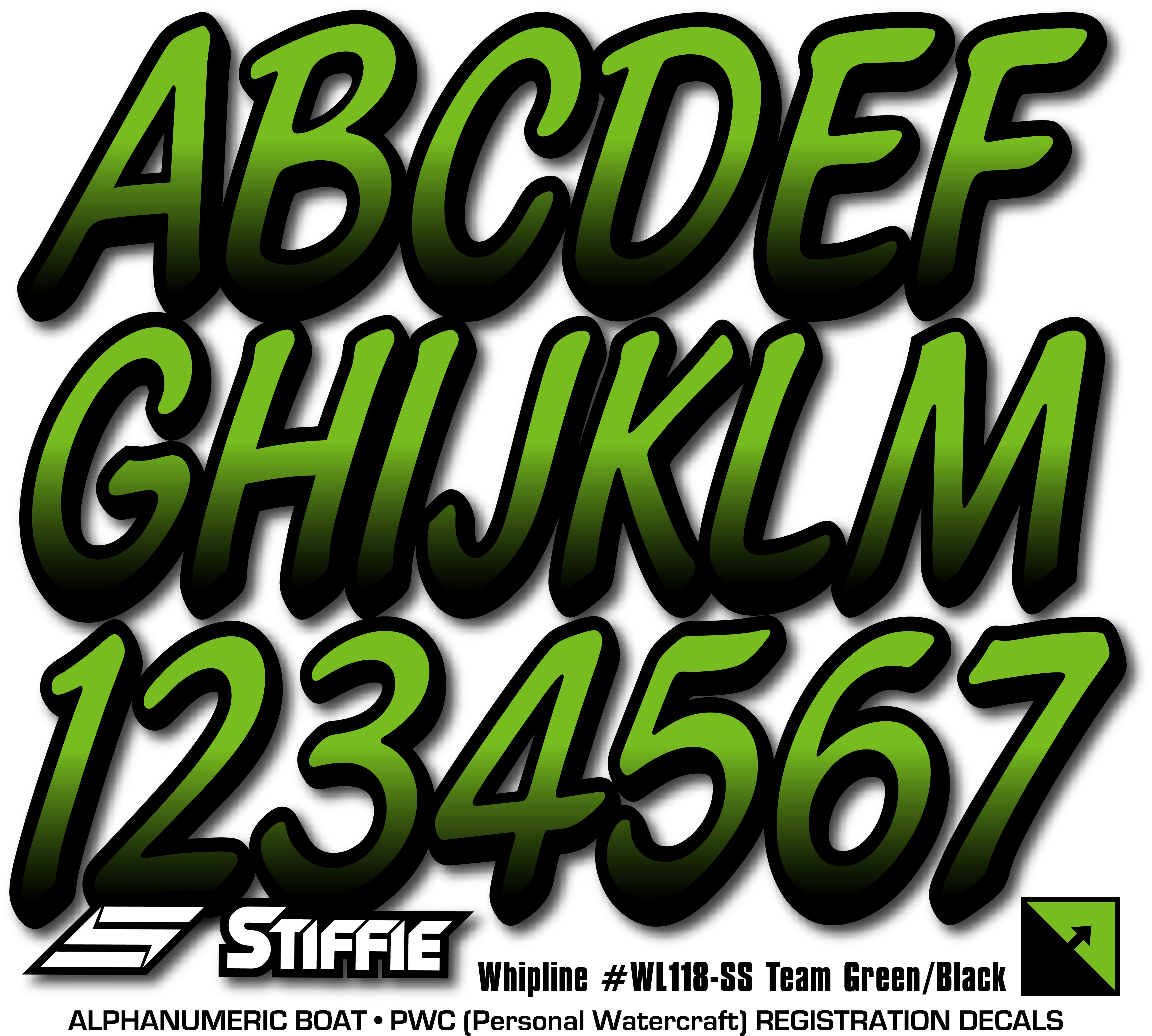 STIFFIE Whipline Team Green/Black 3" Super Sticky Boat & PWC Registration Decals • Numbers Letters Stickers