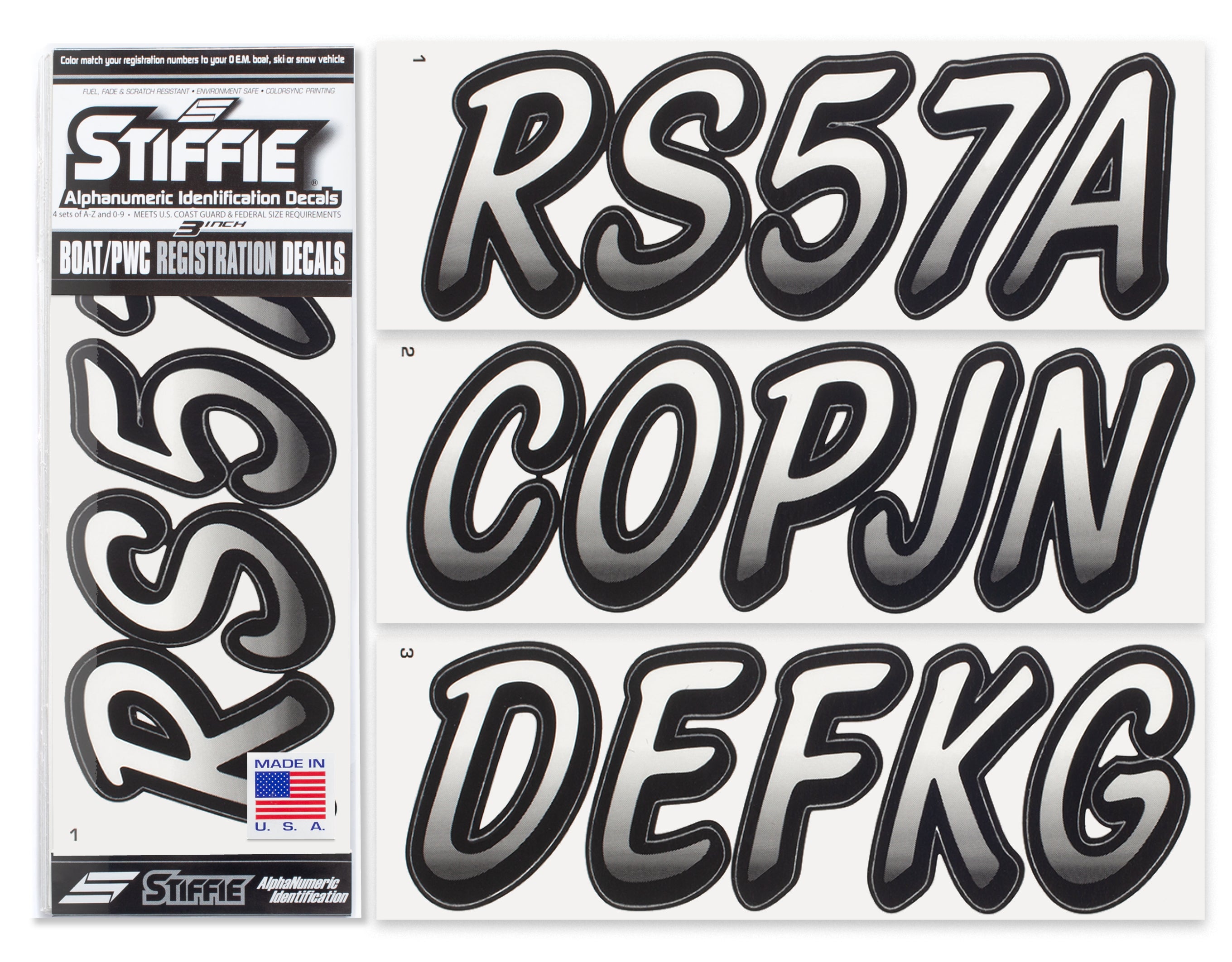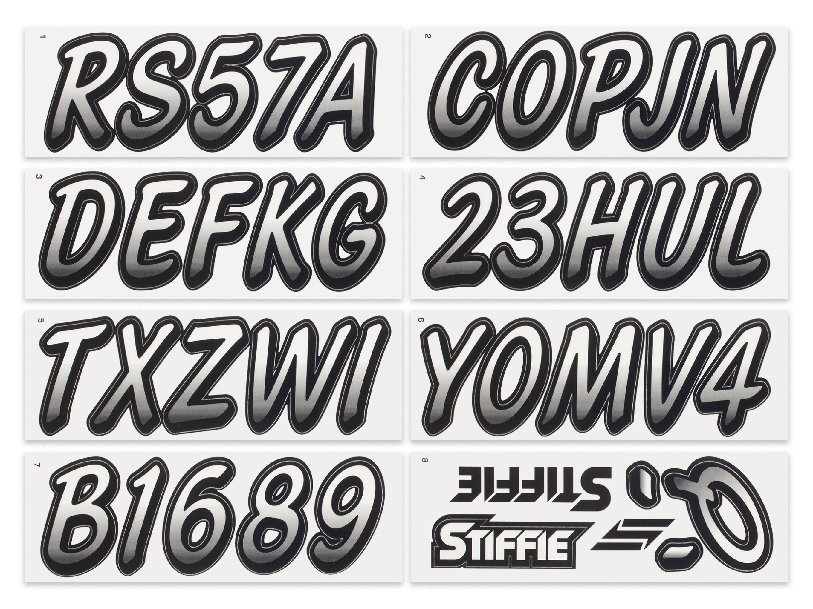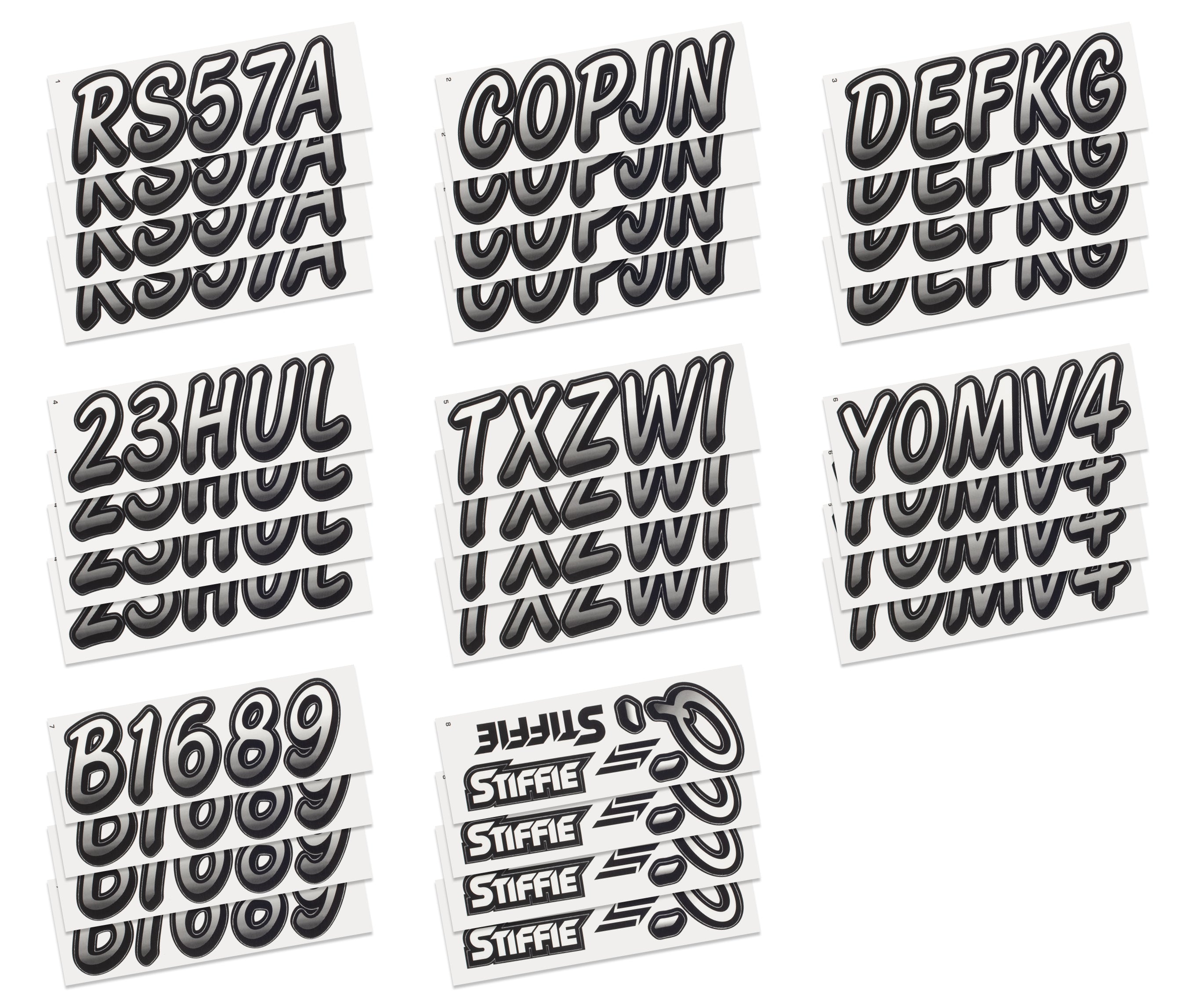 All Alphanumeric ID Kits offered by STIFFIE come with characters that are 3" in height and meet or exceed US Coast Guard Regulations. Every ID kit comes with 4 sets of 0-9 and A-Z decals (146 total decals). STIFFIE Alphanumeric registration decals are resistant to chemical deterioration, fading, curling, tearing and scratching. STIFFIE decals are also UV Coated for protection from harmful ultra-violet (UV) rays.