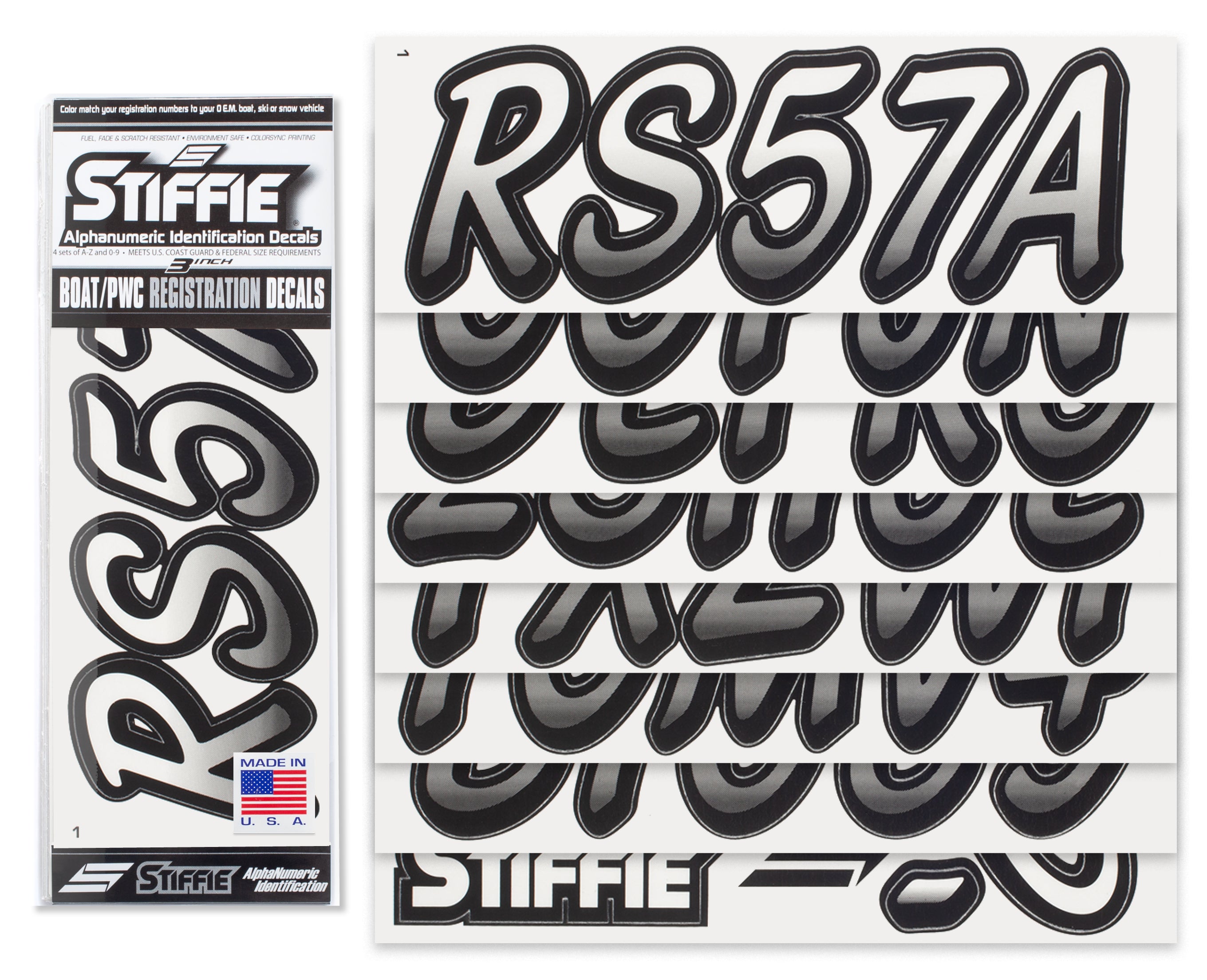 STIFFIE Alphanumeric ID kits are marine registration stickers for all water vessels, boats, personal watercraft. Our decals can also be used for DOT identifier number placement (Department of Transportation), snowmobile registration, or any application that requires the permanent identification or marking of name or number. Our decals are offered in styles and color ways that match your vessels original equipment manufacturer (OEM) color and design scheme.