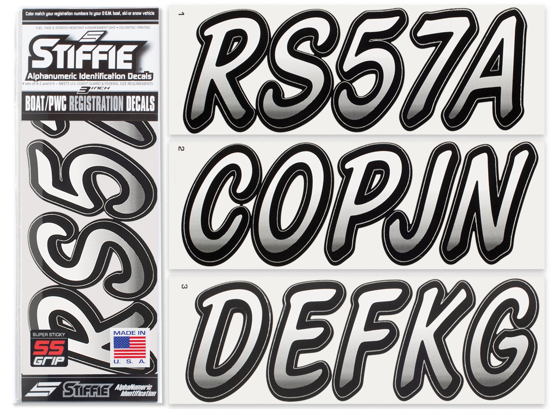 STIFFIE Alphanumeric ID kits are marine registration stickers for all water vessels, boats, personal watercraft. Our decals can also be used for DOT identifier number placement (Department of Transportation), snowmobile registration, or any application that requires the permanent identification or marking of name or number. Our decals are offered in styles and color ways that match your vessels original equipment manufacturer (OEM) color and design scheme.