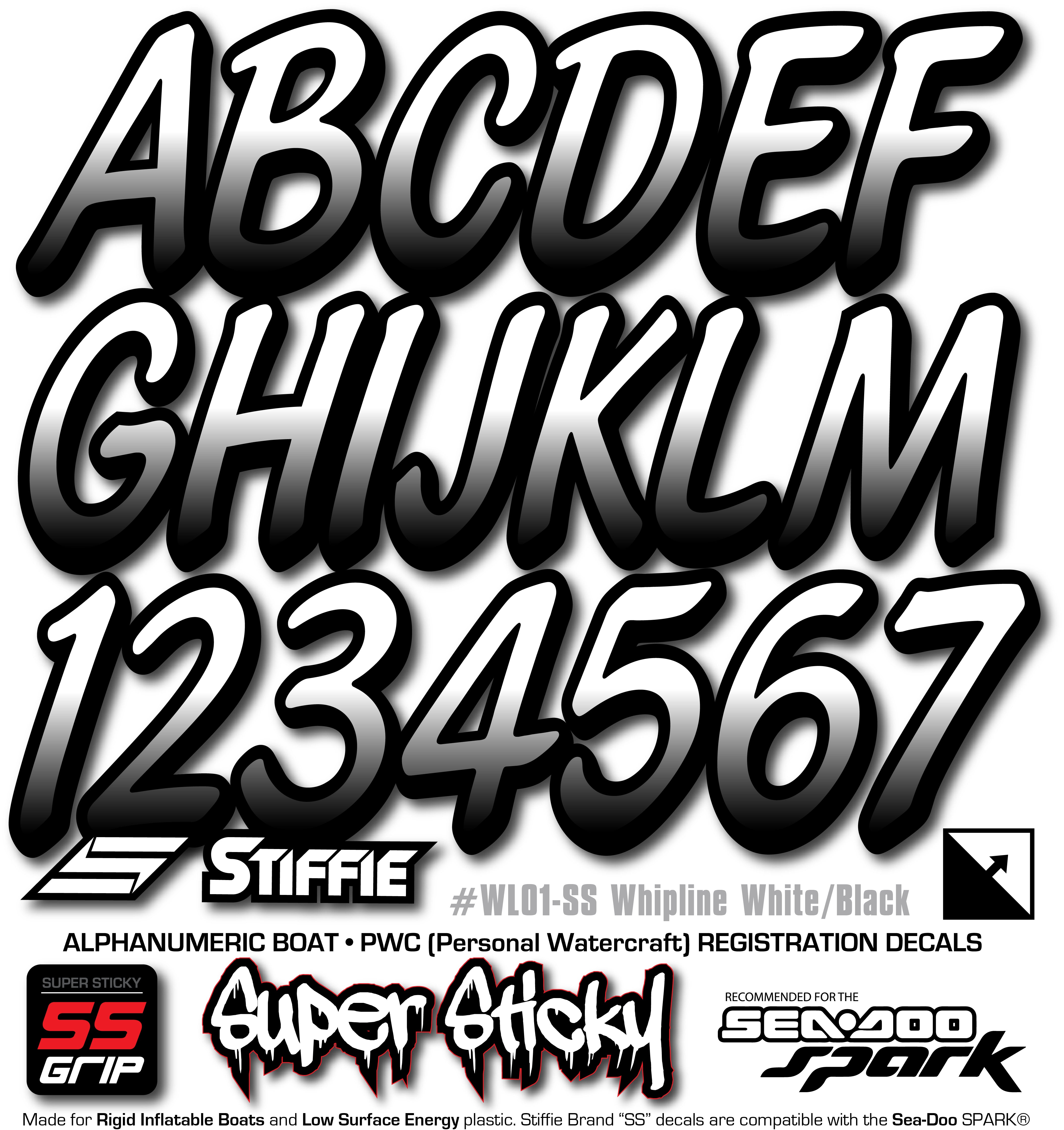 STIFFIE Whipline White/Black 3" Super Sticky Boat & PWC Registration Decals • Numbers Letters Stickers