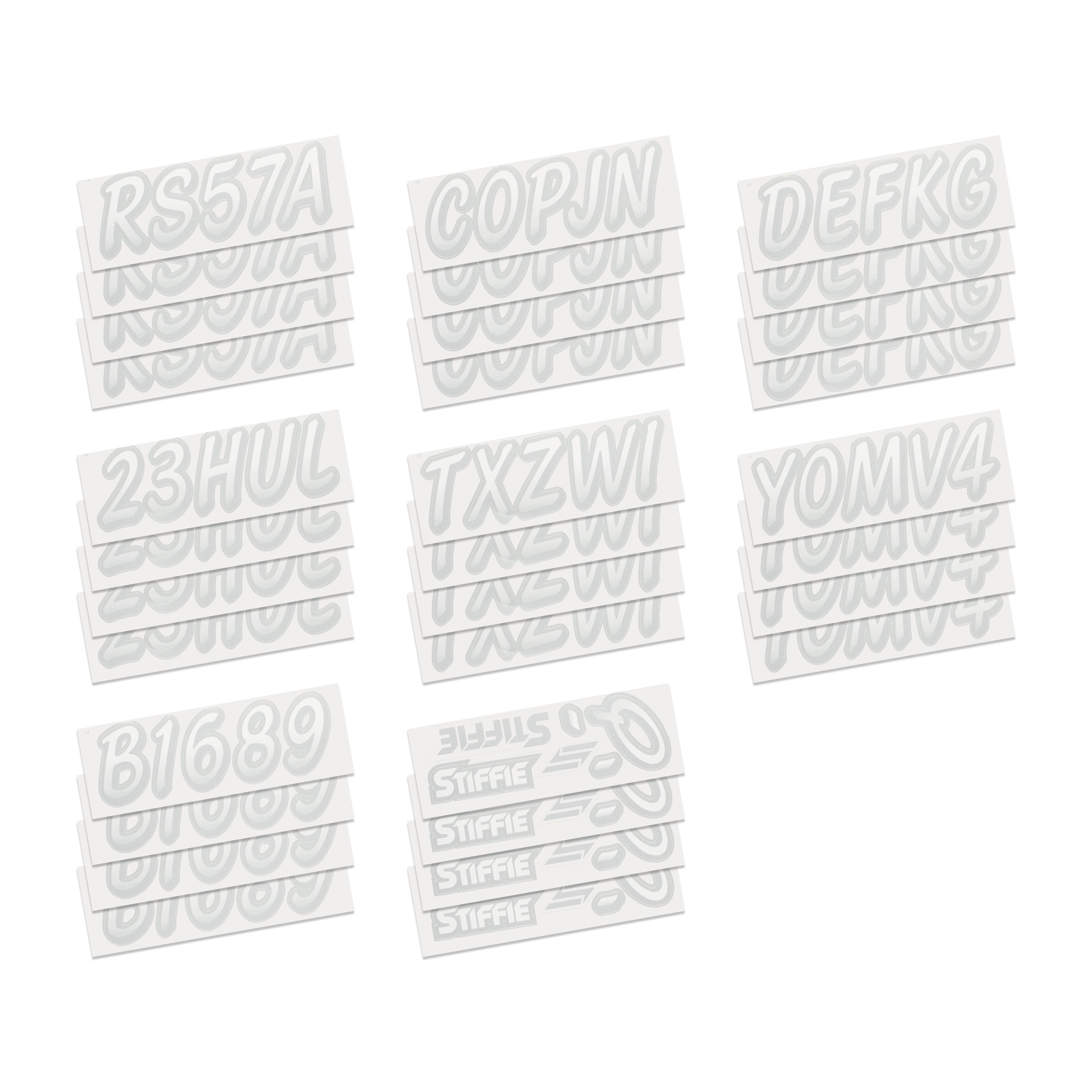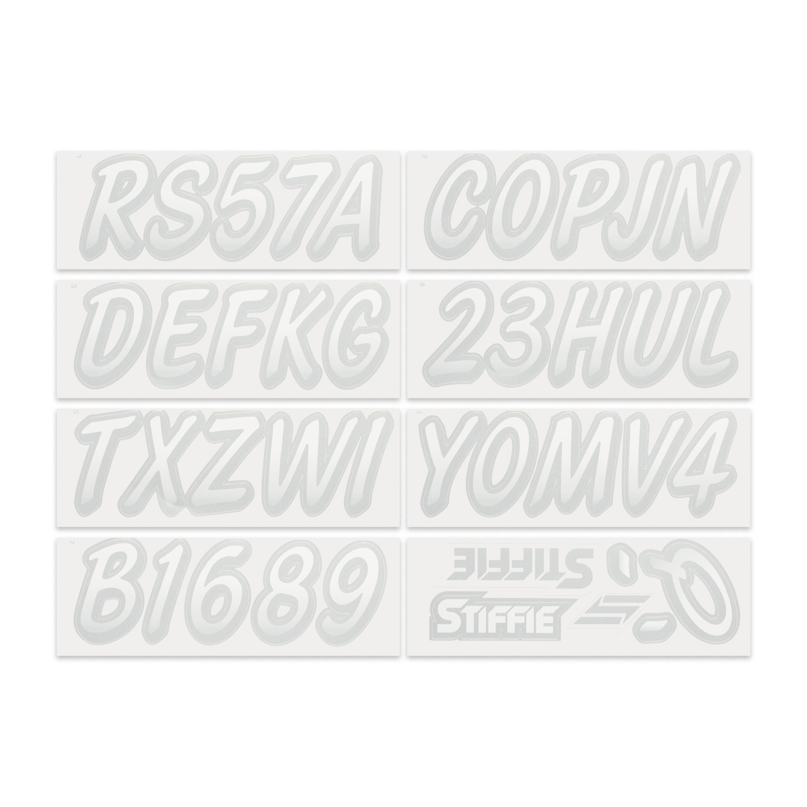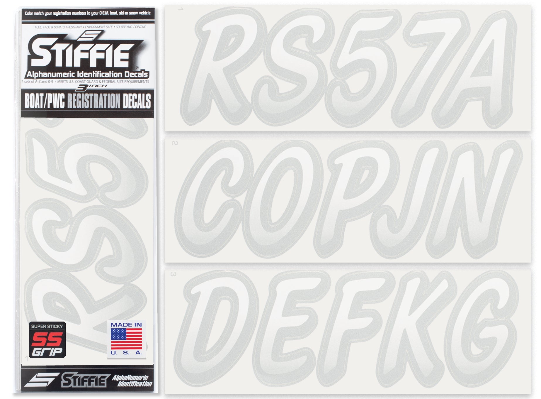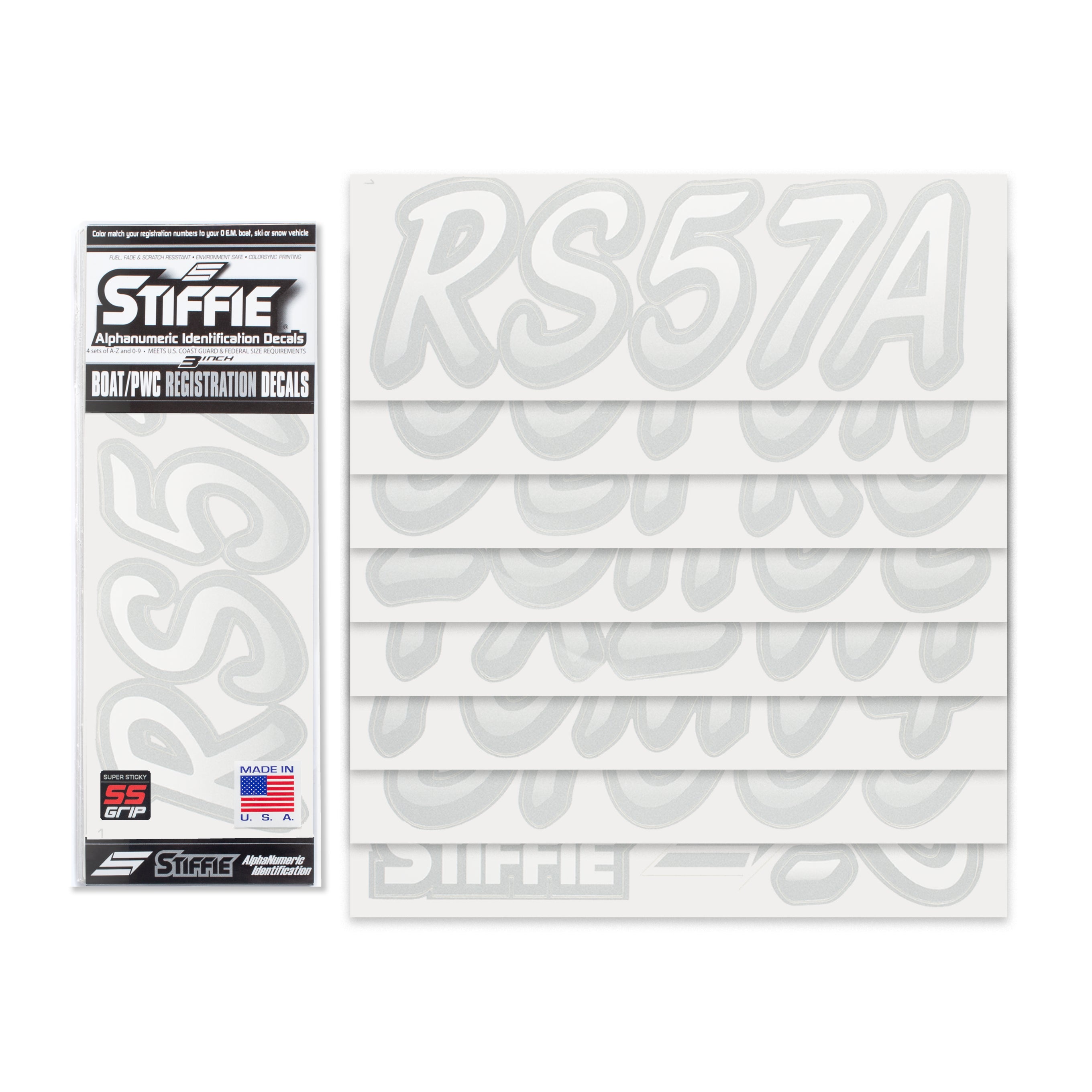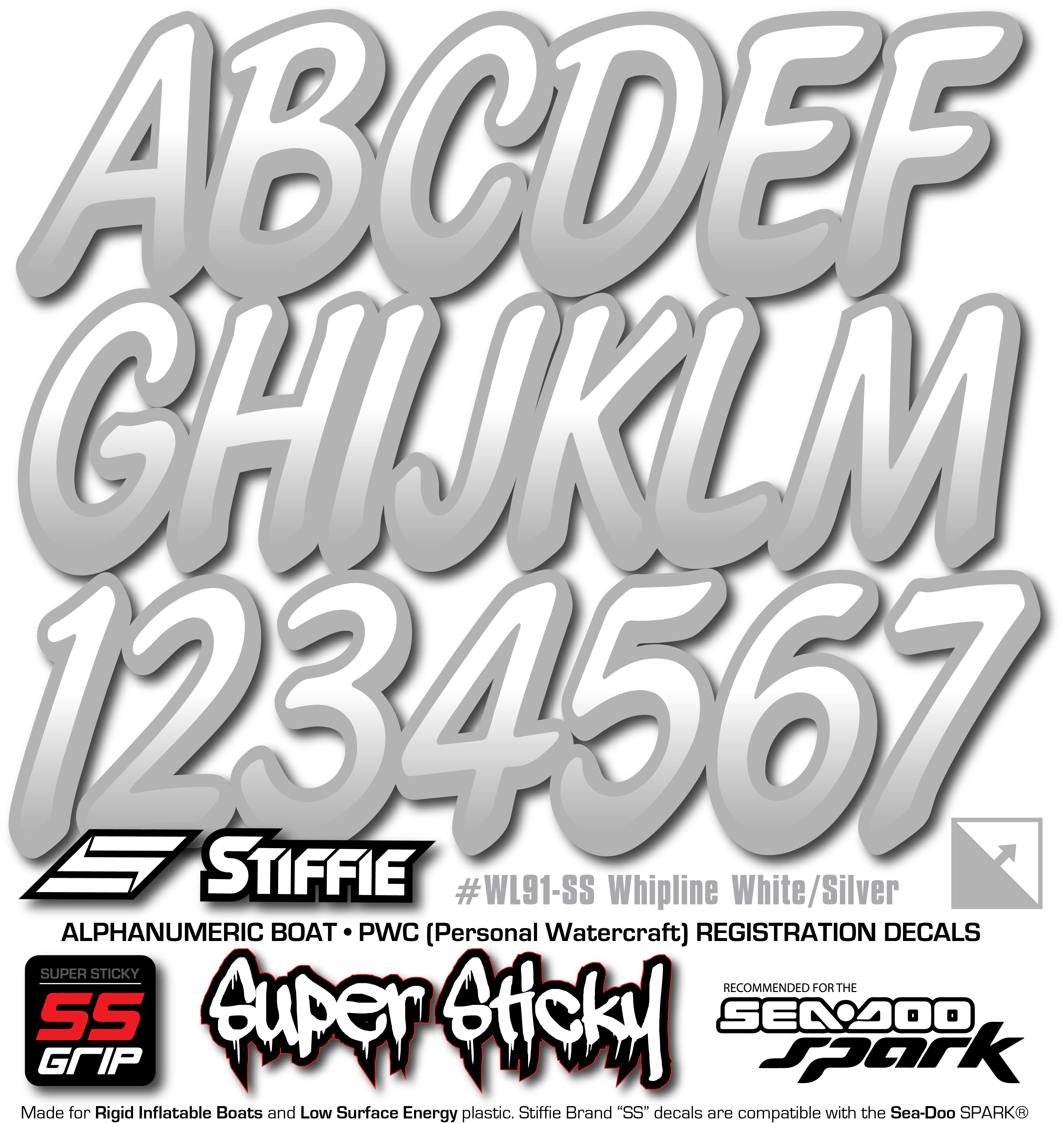 Stiffie Whipline White/Silver Super Sticky 3" Alpha Numeric Registration Identification Numbers Stickers Decals for Sea-Doo Spark, Inflatable Boats, Ribs, Hypalon/PVC, PWC and Boats.