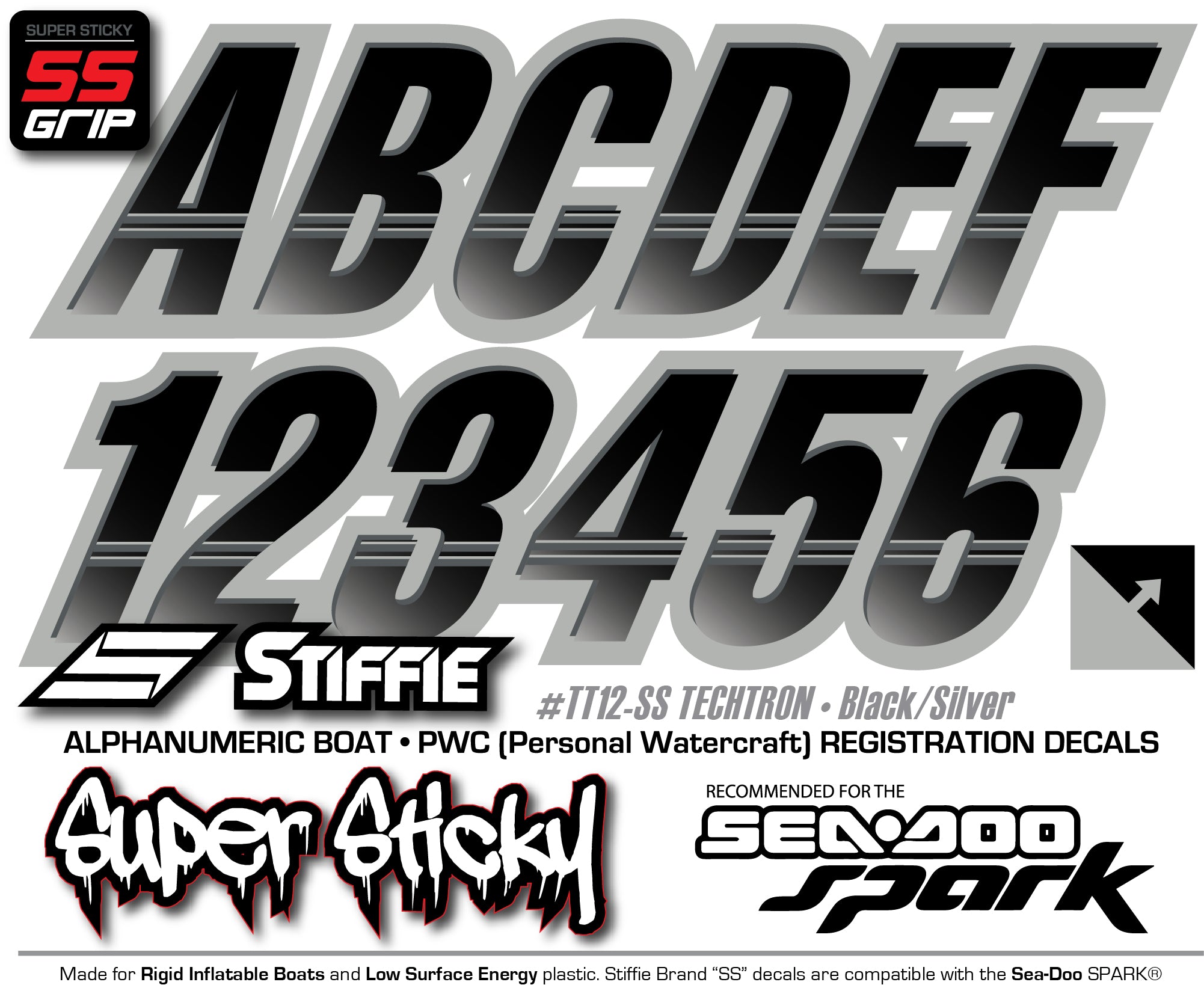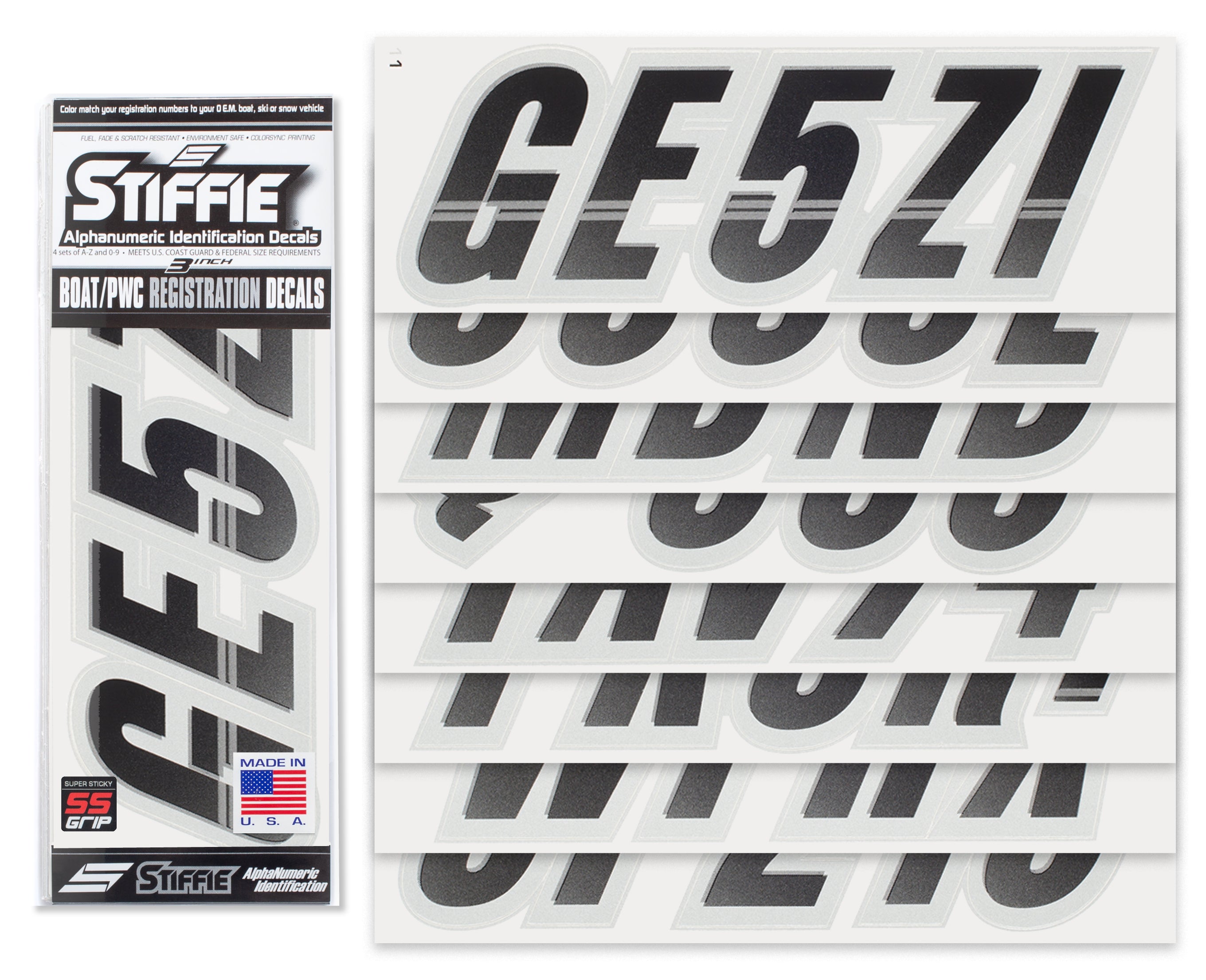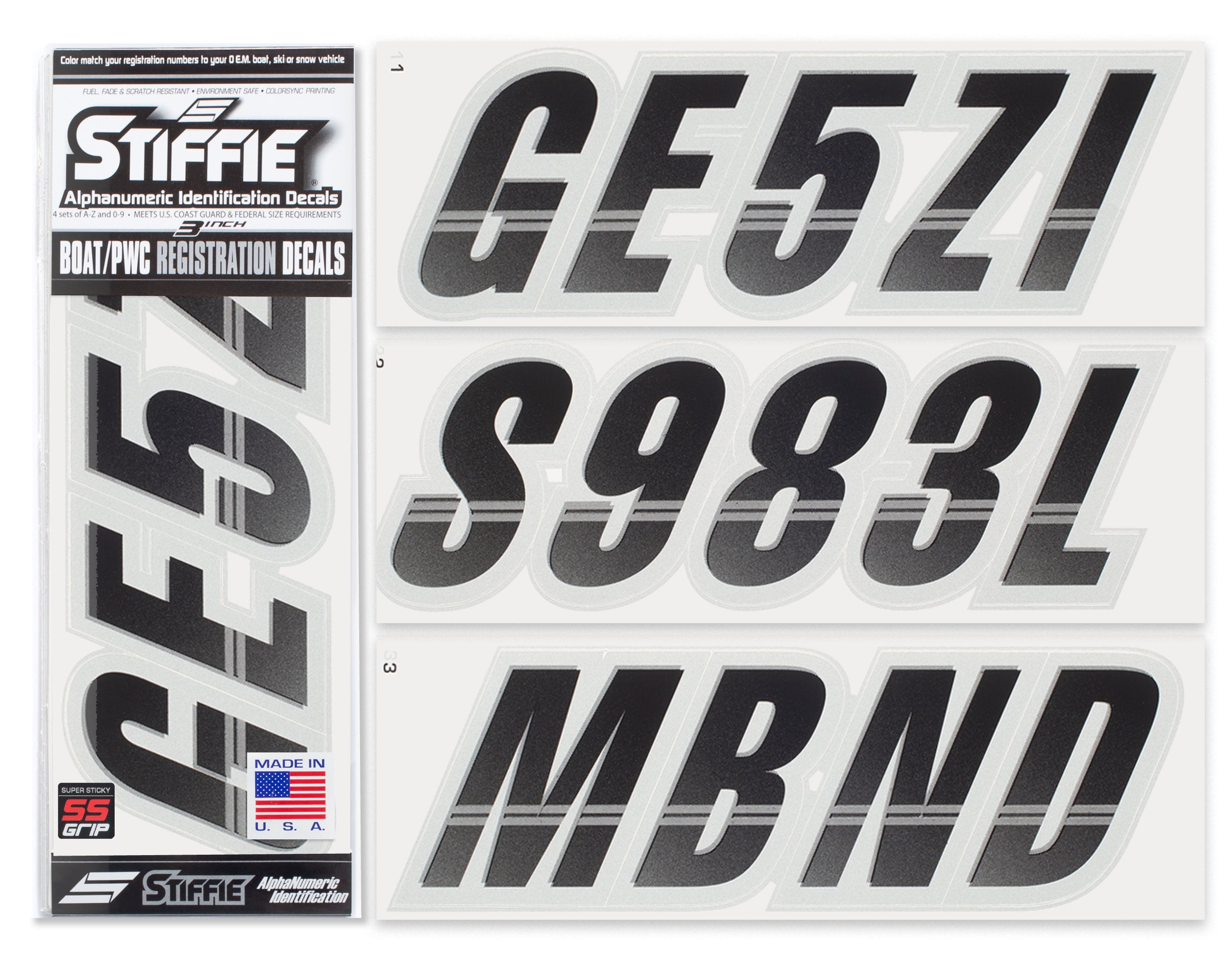 STIFFIE Techtron Black/Metallic Silver 3” Super Sticky Boat & PWC Registration Decals • Numbers Letters Stickers