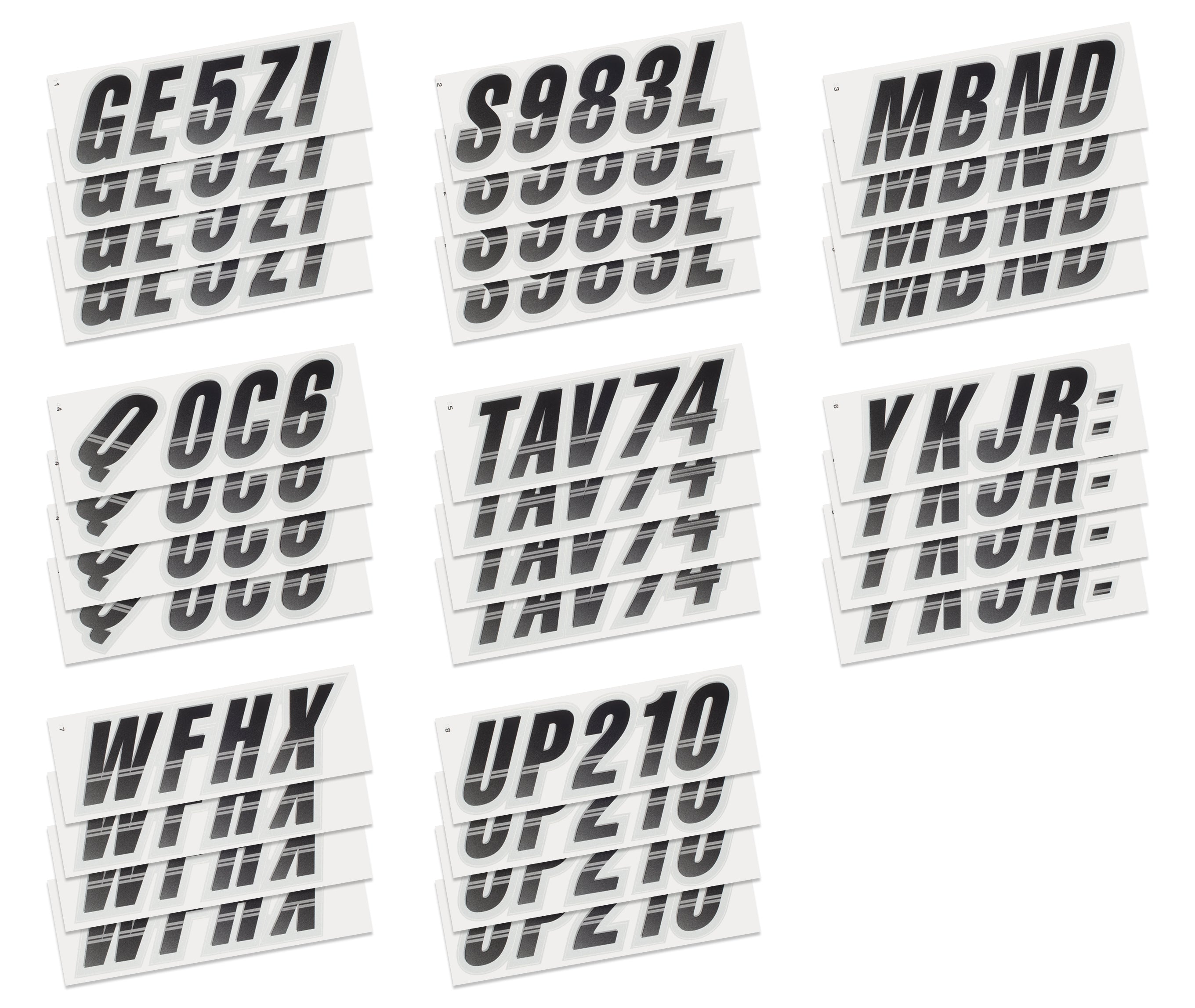The STIFFIE Techtron™ Alpha Numeric Identification Kit has filled the void for a racing inspired boat registration decal. This style’s two-color design features a forward-facing slant with an exterior color fade-in that graduates from the bottom upward. It’s circle track, auto racing inspired form is the basis of the individual characters which are set off by an interior half toned highlight, providing a 3-dimensional look.