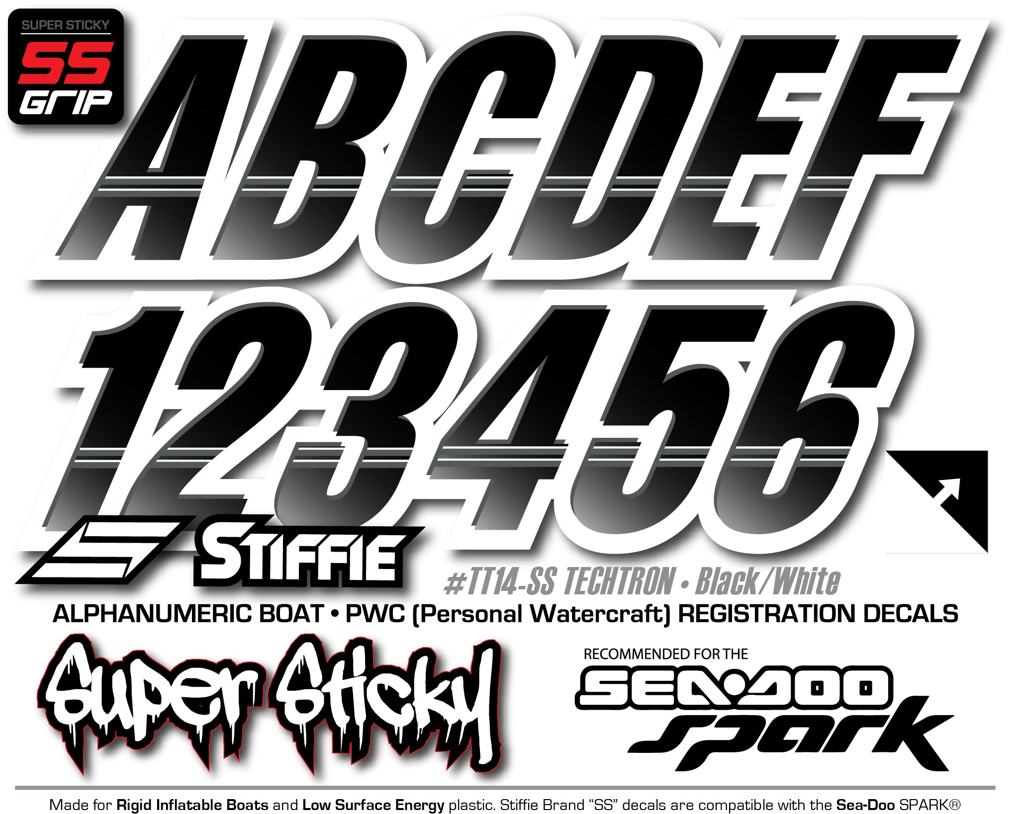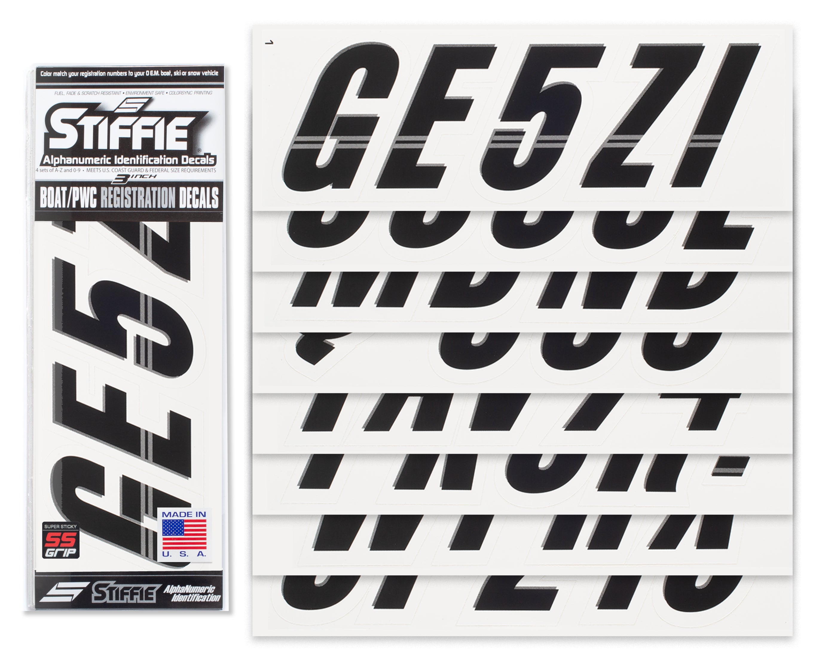 STIFFIE Techtron Black/White 3” Super Sticky Boat & PWC Registration Decals • Numbers Letters Stickers