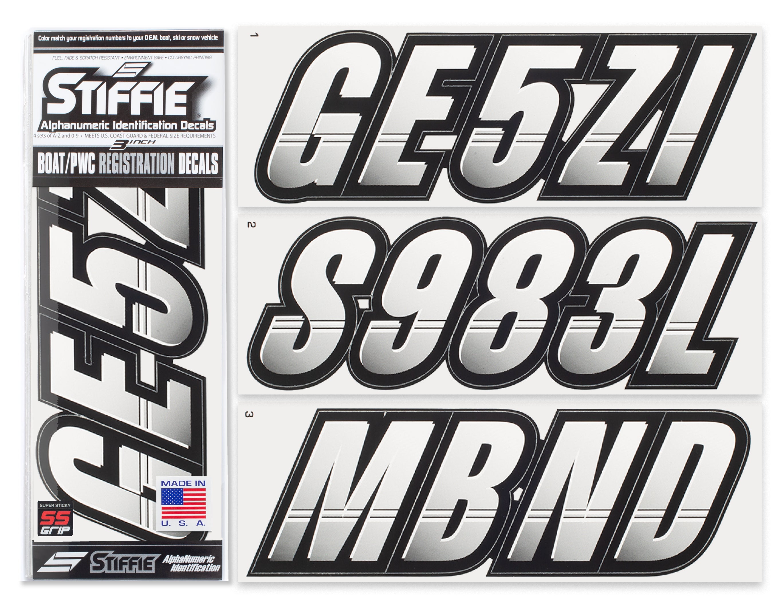 All Alphanumeric ID Kits offered by STIFFIE come with characters that are 3" in height and meet or exceed US Coast Guard Regulations. Every ID kit comes with 4 sets of 0-9 and A-Z decals (146 total decals). STIFFIE Alphanumeric registration decals are resistant to chemical deterioration, fading, curling, tearing and scratching. STIFFIE decals are also UV Coated for protection from harmful ultra-violet (UV) rays.