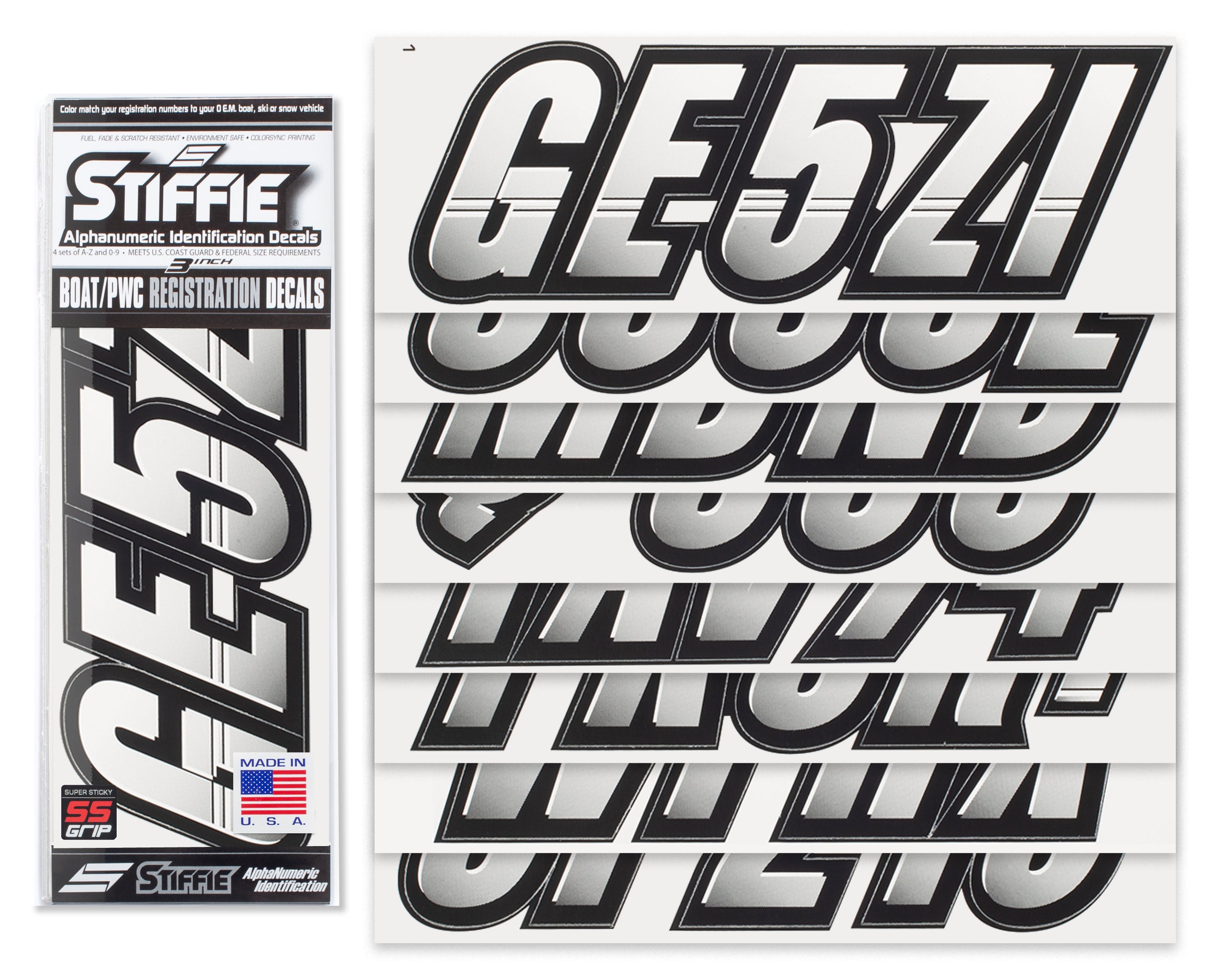 STIFFIE Alphanumeric ID kits are marine registration stickers for all water vessels, boats, personal watercraft. Our decals can also be used for DOT identifier number placement (Department of Transportation), snowmobile registration, or any application that requires the permanent identification or marking of name or number. Our decals are offered in styles and color ways that match your vessels original equipment manufacturer (OEM) color and design scheme.