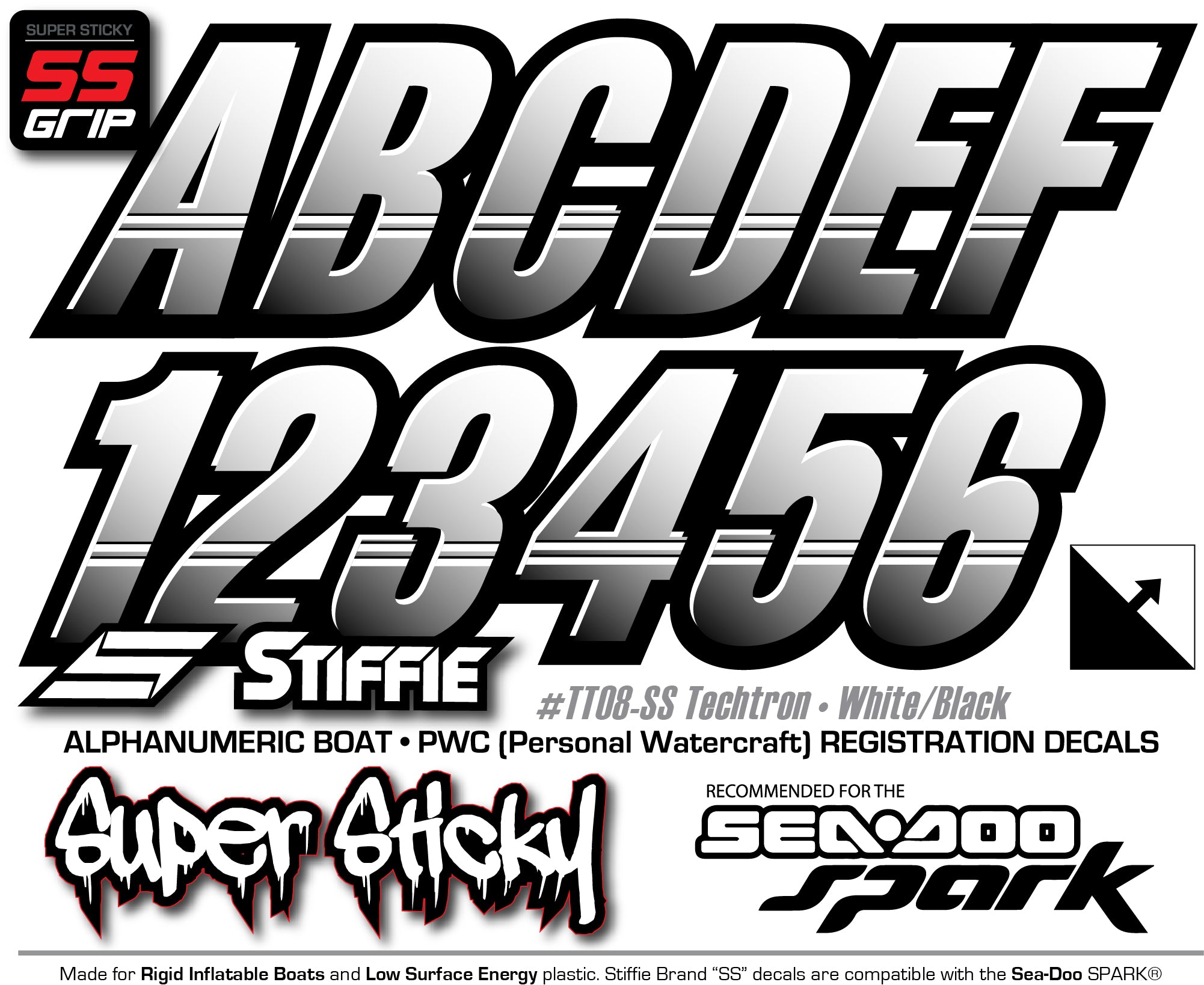 STIFFIE Techtron White/Black 3” Super Sticky Boat & PWC Registration Decals • Numbers Letters Stickers