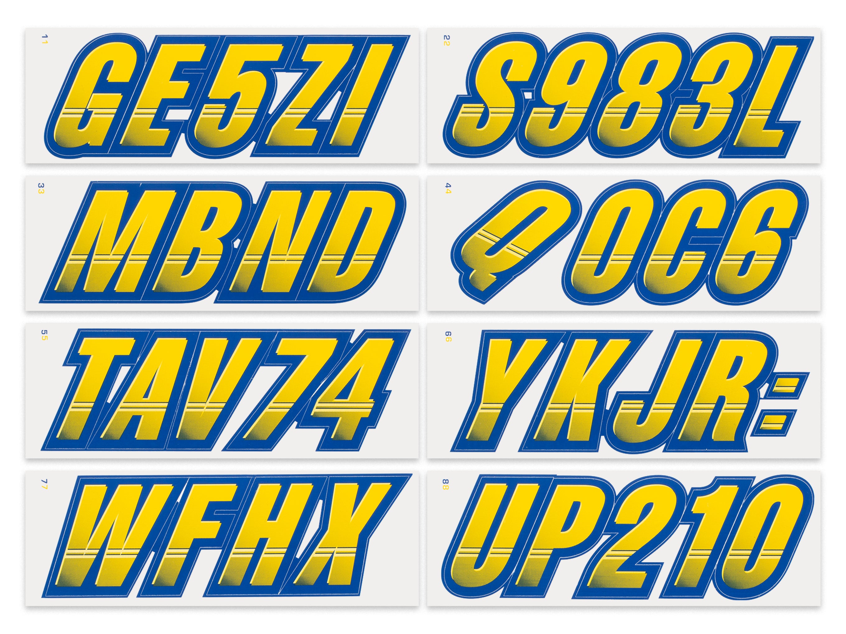 The STIFFIE Techtron™ Alpha Numeric Identification Kit has filled the void for a racing inspired boat registration decal. This style’s two-color design features a forward-facing slant with an exterior color fade-in that graduates from the bottom upward. It’s circle track, auto racing inspired form is the basis of the individual characters which are set off by an interior half toned highlight, providing a 3-dimensional look.