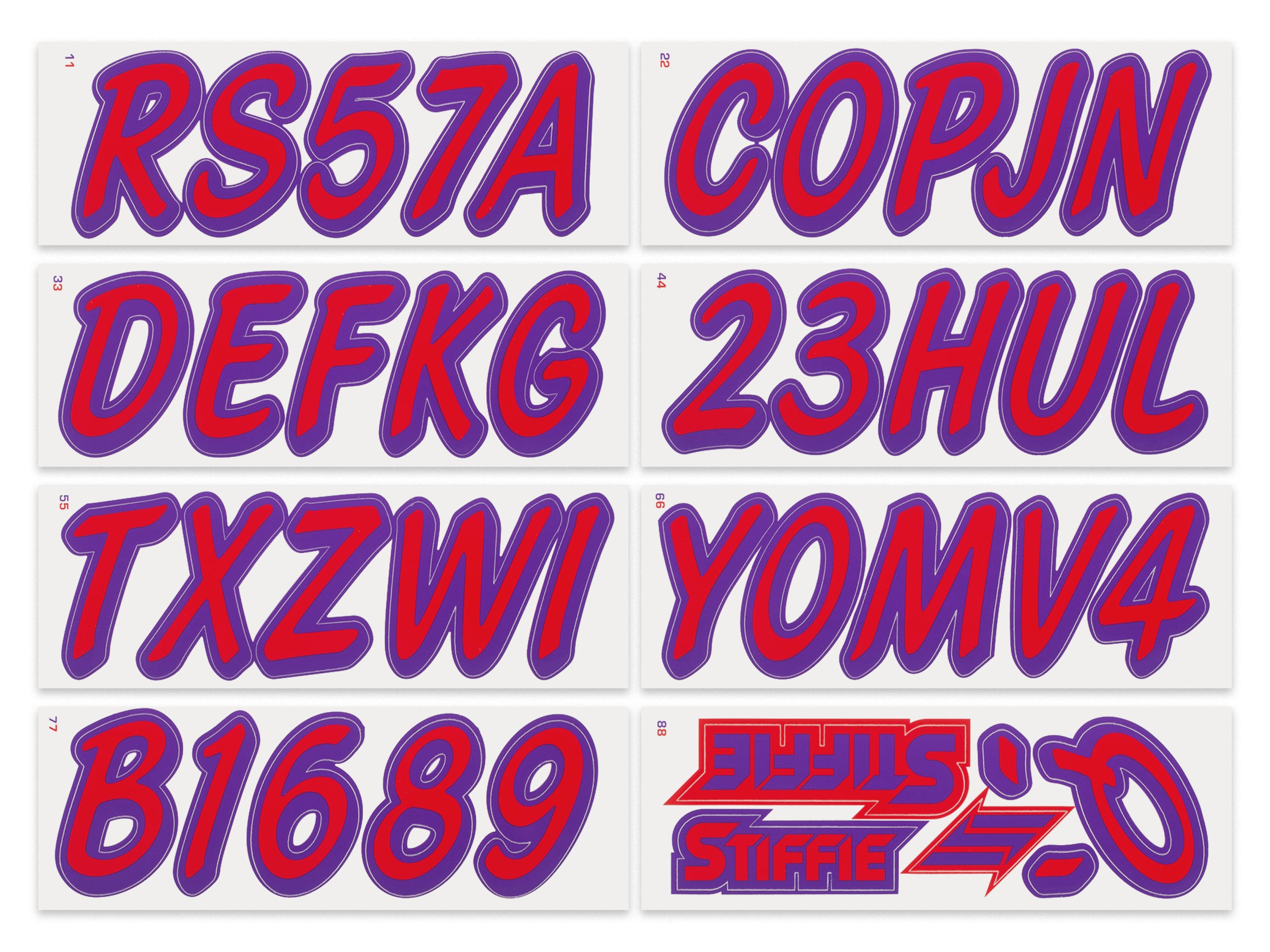 The STIFFIE WhiplineSolid™ Alpha Numeric Identification Kit is a spinoff of our best-selling STIFFIE Whipline™ design. They both use the same cursive font with a forward-facing slant and smooth, rounded edges but STIFFIE WhiplineSolid™ is offered as a solid fill, two-color boat registration numbers and letters.
