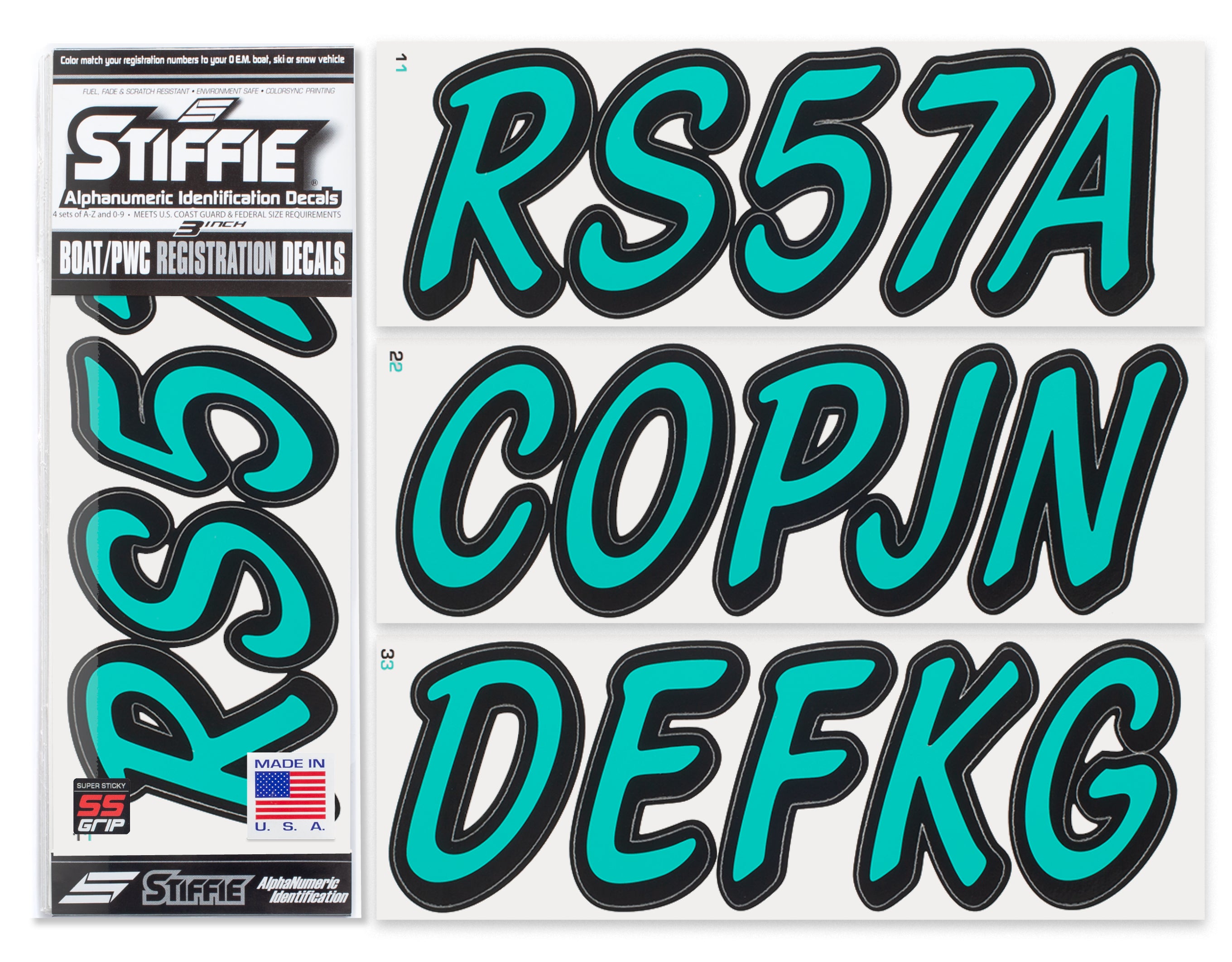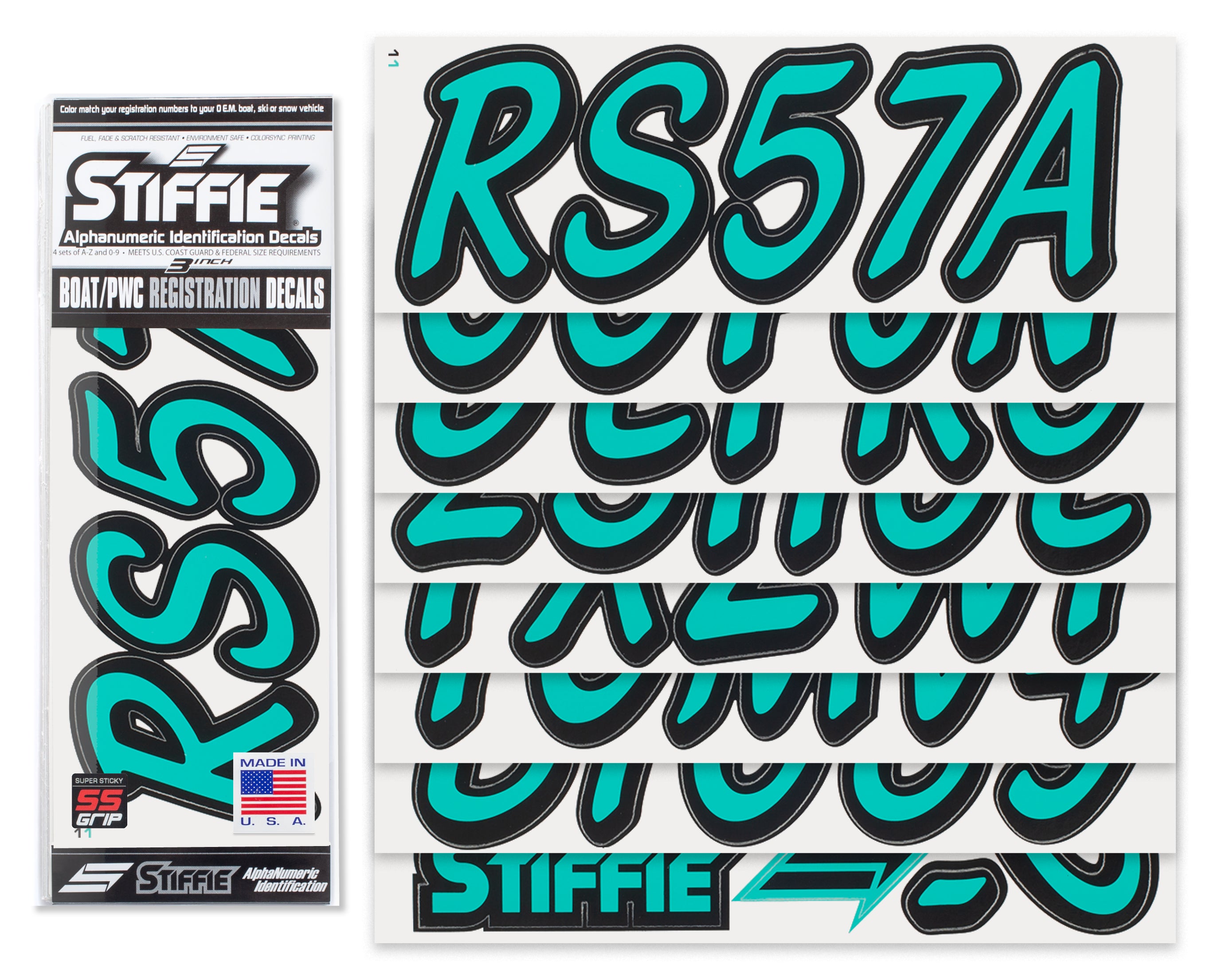 STIFFIE Whipline Solid Sea Teal/Black 3” Super Sticky Boat & PWC Registration Decals • Numbers Letters Stickers