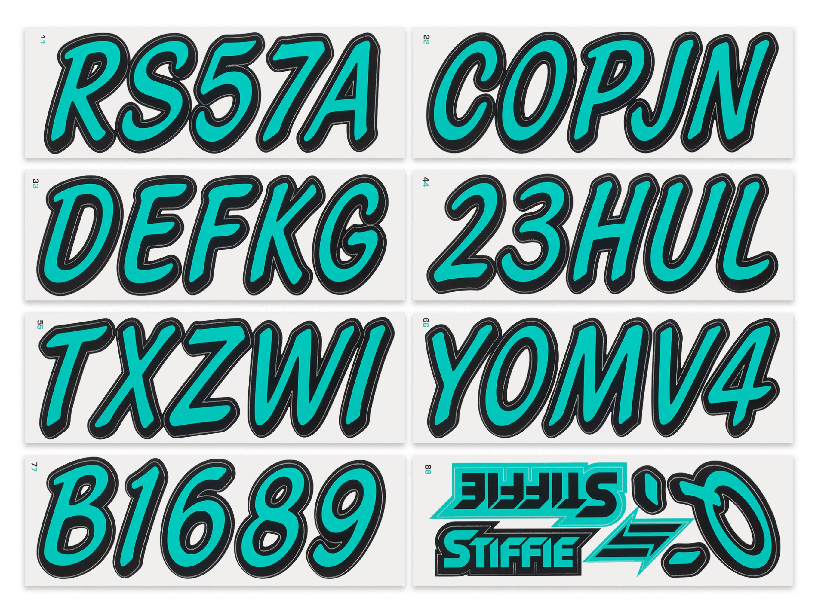 The STIFFIE WhiplineSolid™ Alpha Numeric Identification Kit is a spinoff of our best-selling STIFFIE Whipline™ design. They both use the same cursive font with a forward-facing slant and smooth, rounded edges but STIFFIE WhiplineSolid™ is offered as a solid fill, two-color boat registration numbers and letters.